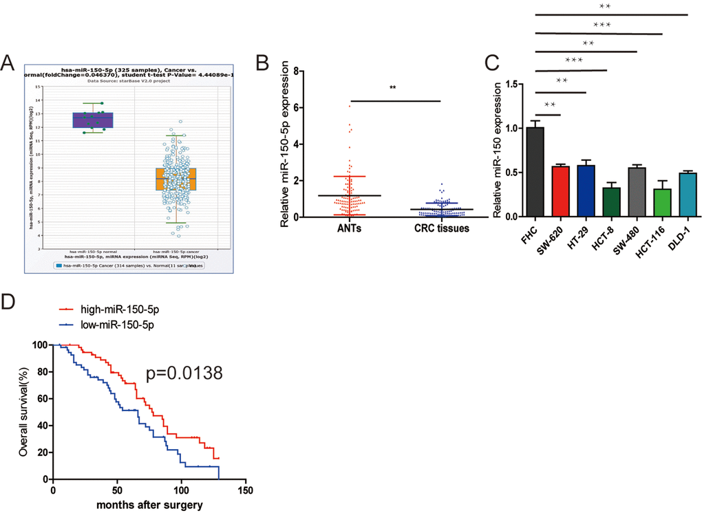 miR-150-5p is downregulated in CRC tissues and cell lines