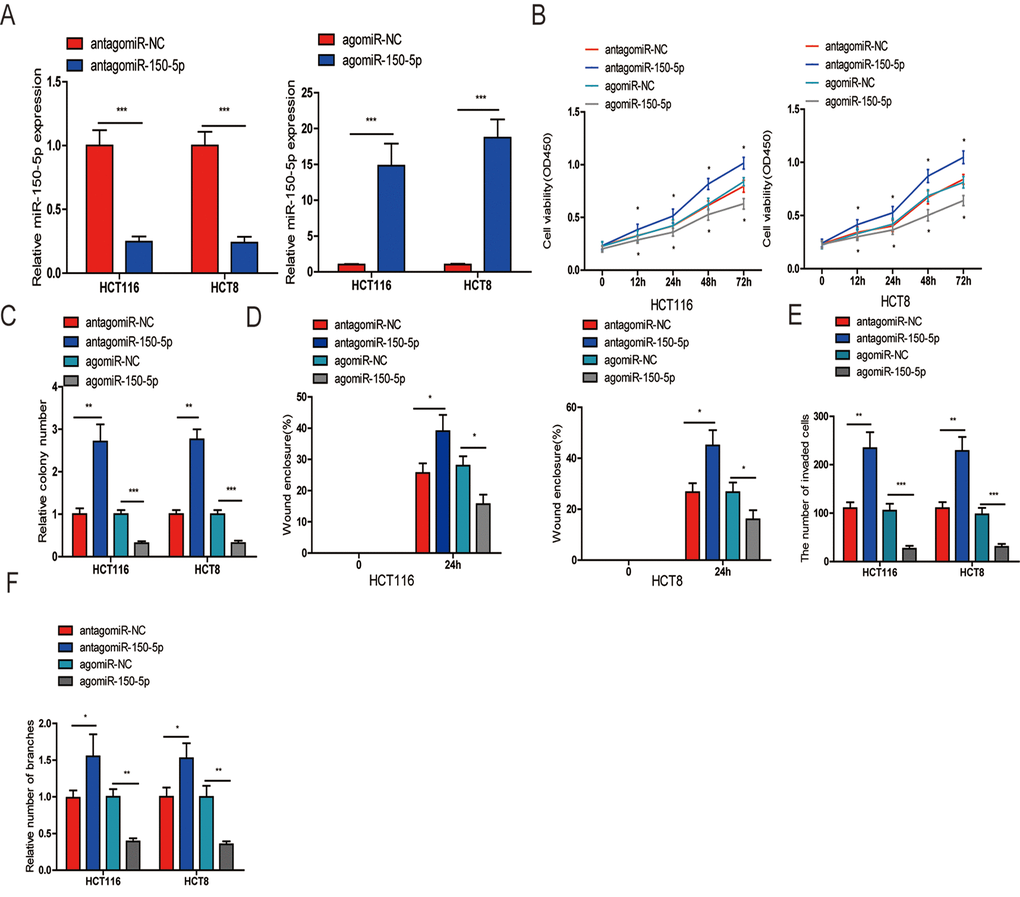 To determine the biological function of miR-150-5p in CRC, we selected HCT116 and HCT8 cells for transfection of agomiR-150-5p and antagomiR-150-5p or their corresponding negative controls (agomiR-NC and antagomiR-NC). The efficiency of transfection was confirmed by qRT-PCR (Fig. 2A). First, a CCK-8 assay performed to assess CRC cell growth showed that upregulation of miR-150-5p resulted in decreased cell proliferation, while the inhibition of miR-150-5p expression obviously increased cell proliferation in HCT116 and HCT8 cells (Fig. 2B). A colony formation assay further substantiated the role of miR-150-5p in inhibiting the proliferation of CRC cells (Figs. 2C and Fig. S1A). Next, wound-healing and transwell invasion assays were performed in HCT116 and HCT8 cells. As shown in Figs. 2D and and Fig. S1C, the migratory and invasive abilities were significantly reduced when miR-150-5p expression was increased, while miR-150-5p downregulation significantly increased cell migration and invasion in HCT116 and HCT8 cells. Additionally, to explore whether miR-150-5p was a key angiogenesis suppressor in CRC, we investigated the influence of miR-150-5p on HUVEC tube formation and showed that miR-150-5p upregulation obviously reduced the tube-formation capacity, while silencing miR-150-5p increased the tube-formation ability of HUVECs (Fig. 2F and Fig. S1D).