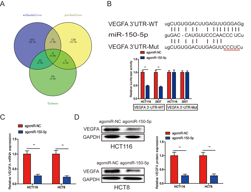 Many miRNAs have been reported to be dysregulated and exert their functions mainly through their target genes [13,14]. The PicTarSites, miRandaSites and Tarbase databases were used to search for potential target genes of miR-150-5p. As shown in Fig. 4A, eight potential genes were predicted in all four databases. VEGFA, which was selected as a target gene of miR-150-5p, is closely associated with metastasis and angiogenesis of human cancers. Next, dual-luciferase reporter assays were used to determine whether VEGFA was a direct target gene in CRC cells. The 3’-UTR of VEGFA wild-type (WT-VEGFA-3’UTR), as well as VEGFA mutant type (Mut-VEGFA-3’UTR) were constructed and cloned into pmirGLO luciferase reporter, then cotransfected with agomiR-150-5p or agomiR-NC into HCT116 and 293T cells. Luciferase reporter assay confirmed that miR-150-5p overexpression obviously reduced the luciferase activity of pmirGLO-VEGFA-3’UTR-WT but showed no significant effect on the luciferase activity of pmirGLO-VEGFA-3’UTR-Mut (Fig. 4B). Additionally, qRT-PCR and Western blot analyses showed that both VEGFA mRNA and protein levels are dramatically decreased after miR-150-5p upregulation in HCT116 and HCT8 cells (Fig. 4C, 4D).
