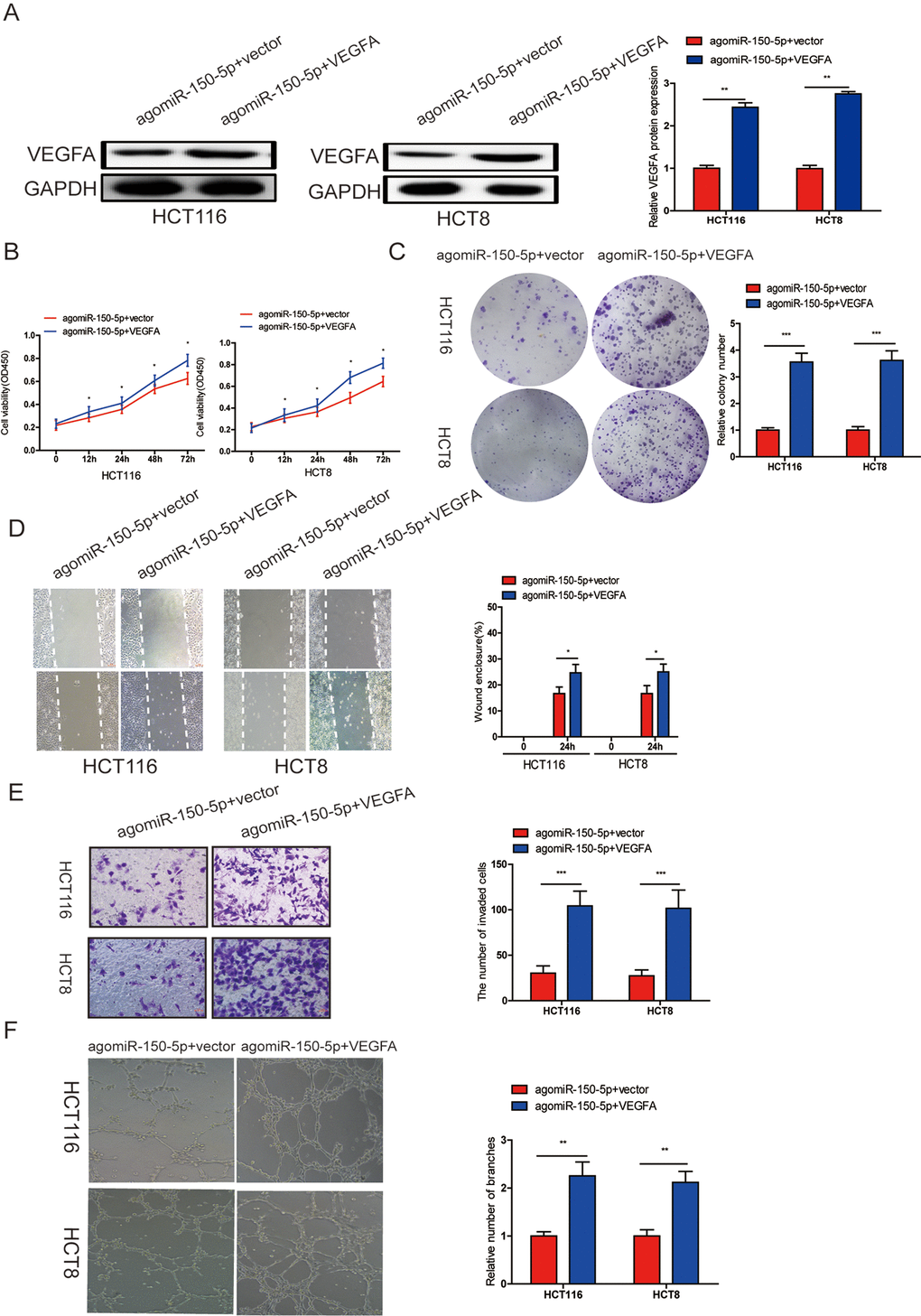 To investigate whether miR-150-5p suppressed proliferation, migration, invasion, angiogenesis and EMT process through VEGFA, we cotransfected agomiR-150-5p and pcDNA 3.1-VEGFA or empty vector, and VEGFA upregulation was verified by western blotting (Fig. 5A). Through CCK-8, colony formation, wound-healing, transwell invasion and tube formation assays, we found that ectopic VEGFA expression could partially reverse the suppression of proliferation (Fig. 5B, 5C), migration (Fig. 5D), invasion (Fig. 5E) and angiogenesis (Fig. 5F) caused by miR-150-5p overexpression. These data indicated that VEGFA was not only a direct target gene but also a functional mediator of miR-150-5p in CRC.