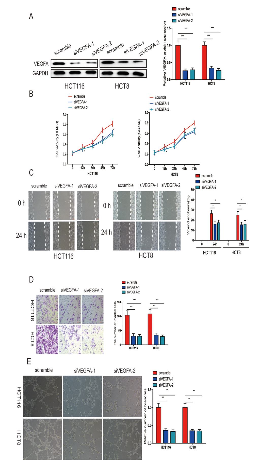 To further verify that miR-150-5p exerts its inhibitory effect via VEGFA, we knocked down VEGFA in HCT116 and HCT8 cells (Fig. 7A) and found that this markedly suppressed CRC cell growth, migration, invasion and HUVEC tube formation (Fig. 7B-7E). These data further proved that miR-150-5p exerted its biological function by inhibiting VEGFA expression.