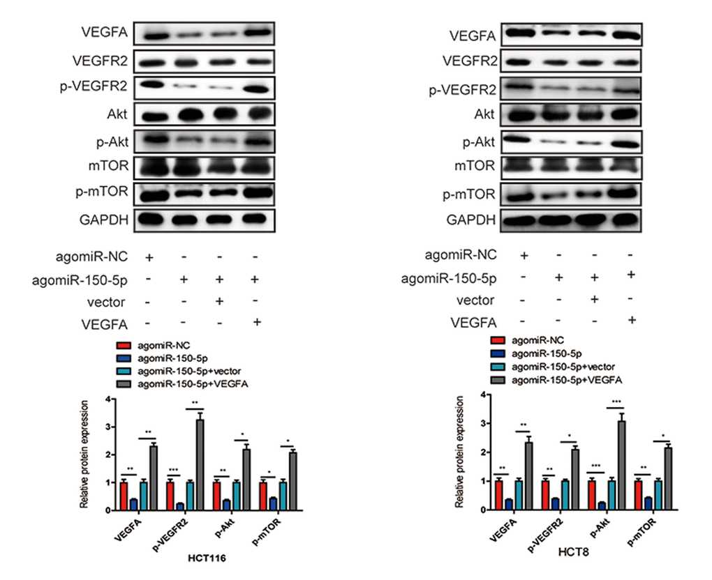 VEGFA/VEGFR2/Akt/mTOR signaling pathway on the tumorigenesis and progression of CRC. This research not only provides a new insight into the mechanism of CRC progression but also highlights miR-150-5p as a potential diagnostic biomarker and therapeutic target of CRC.
