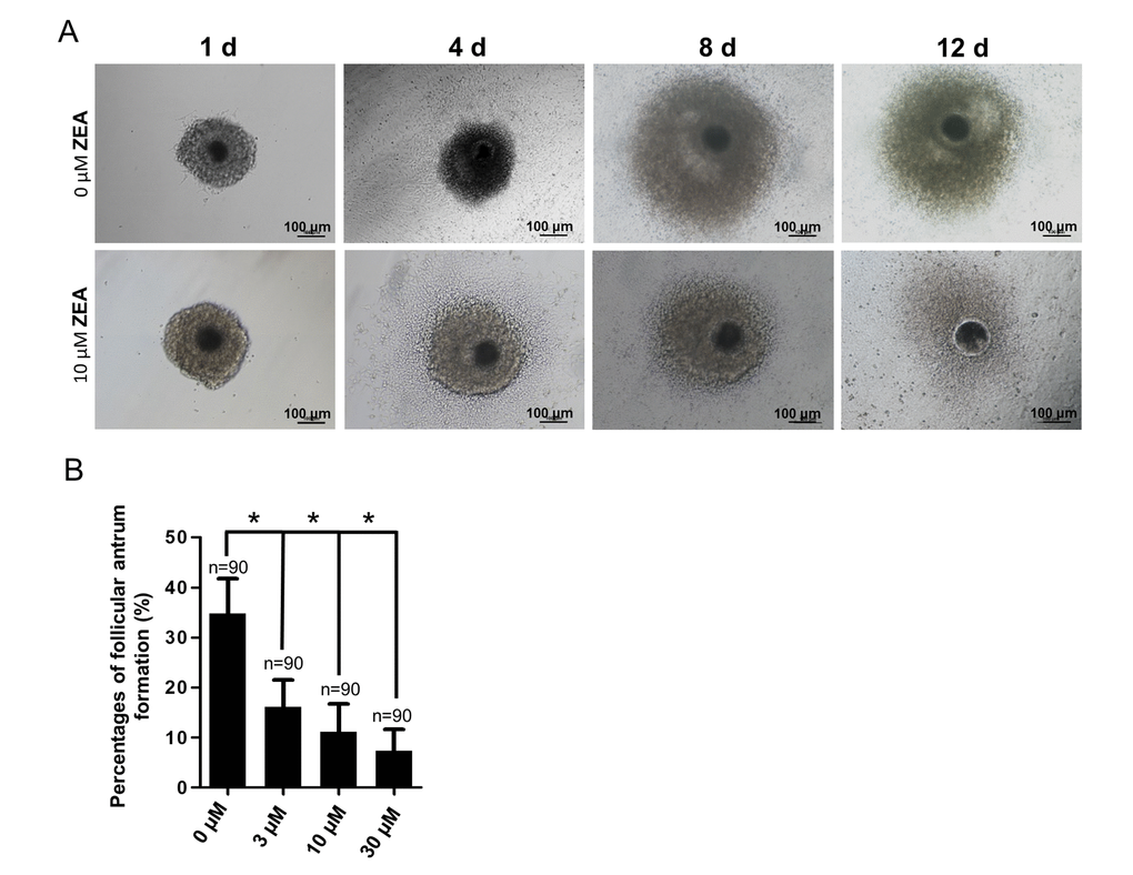 ZEA was purchased from Sigma-Aldrich (Z2152), and diluted by DMSO at 2000 μM concentration and stored at - 20 ºC in darkness. For assessing the effects of ZEA on follicular growth, each well contained 0, 3, 10 or 30 μM with equal solvent concentration (0.5% DMSO).