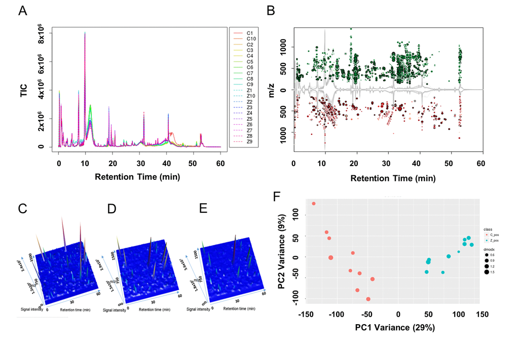 The UPLC-QTOF raw data was preprocessed and analyzed by correcting the data with sodium formatting and transforming the raw data into mzXML using CompassXport software. After this, the R package xcms was used to analyze the data online (https://xcmsonline.scripps.edu/). The raw data went through filter and identify peaks, samples grouping, retention time correction, filling the missing peak, and was statistically analyzed. For identifying significantly different metabolites, a personal R script was used to calculate. For the representative features’ identification, the mass weight was inputted into the METLIN database (https://metlin.scripps.edu/) for searching. The parameter adduct ion was supposed to be likely to M+H+ or M+Na+, with the fault-tolerant of ± 10 ppm. The Orbitrap data acquisition utilized xcailibur software.