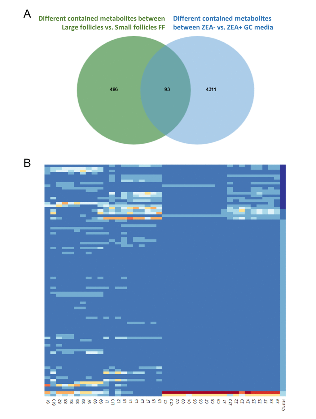 GCs were collected from small follicles (< 2 mm). The cell pellet was resuspended with PBS for washing, centrifuged at 1500 rpm for 5 min. The recovered cells were then cultured in M199 (Hyclone, SH30253.01B) +10% FBS + 100 IU penicilin-streptomycin media, in 38.5 ºC, 5% CO2 condition. After 24 h the media was changed and at 72 h, the cells were transferred into 24-well plate, with 1×105 cells/well. After being cultured for 24 h, the media was removed and the cells were washed 3 times with PBS and then, 1 mL fresh media supplement with 5 μL DMSO solvent (vehicle control) or ZEA 10 μM (with equivalent DMSO solvent). After being treated for 24 h, the media was collected and centrifuged at 1500 rpm, 4 ºC for 10 min. After that, 50 μL media sample was transferred into a new microcentrifuge tube and 150 μL deionized water and 600 μL methanol added and thoroughly mixed. The mixture was centrifuged at 12000 rpm, 4 ºC for 15 min, the suspension transferred into a new microcentrifuge tube and then kept frozen at - 80 ºC until required for mass spectrometry detection. After 3 collections, 10 groups of control and 10 groups of ZEA treated GC media were obtained.