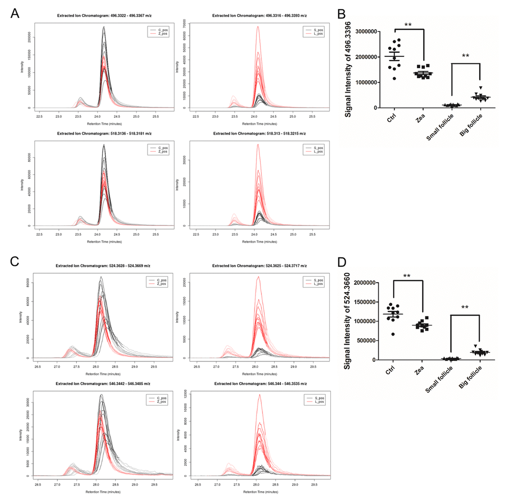 In total, 112 features with a trend were filtered (Table S8). After querying the potential annotations in the METLIN database, 93 potential metabolites could be queried (Figure 3A). The components of each metabolite among groups were shown in Figure 3B. We noticed the features with the molecular weight of 496.3351 (518.3168, with the formula of the parent ion C24H50NO7P), 524.3660 (546.3475, with the formula of the parent ion C26H54NO7P) (Figure 4A and 4C), 522.3505 (544.3321, with the formula of the parent ion C26H52NO7P) (Table S8 and Table S9). It seems that these chemicals could have a similar structure as a phospholipid (Table S8 and Table S9). All three metabolites significantly were accumulated during antrum follicle growth, while were depleted in the 10 μM ZEA treated GC culture media (P < 0.01; Table S8; Figure 4B and 4D).
