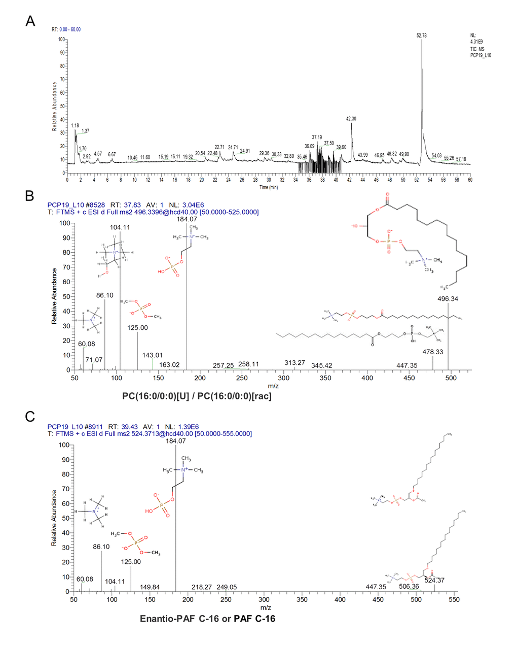 To accurately identify these ions and proposed the structures, we used Q Exactive Obitrap MS in selecting ion monitor mode to detect the daughter ion. In the total ion current plots, all 3 features were eluted between 34 - 41 min (Figure 5A). From the daughter ion information, the exact structure of the C24H50NO7P and C26H54NO7P were presented. C24H50NO7P with an annotation of PC (16:0/0:0) [U] / PC (16:0/0:0) is a phospholipid derivative called LPC (Figure 5B). C26H54NO7P with an annotation of enantio-PAF C-16 or PAF C-16 is a phospholipid activator called platelet-activating factor (Figure 5C). There was a significant increase in the content of LPC and PAF in the FF during porcine follicle growth, and 10 μM ZEA could lead to a depletion of LPC and PAF in the cultured GC media (P < 0.01; Figure 4B and 4D).