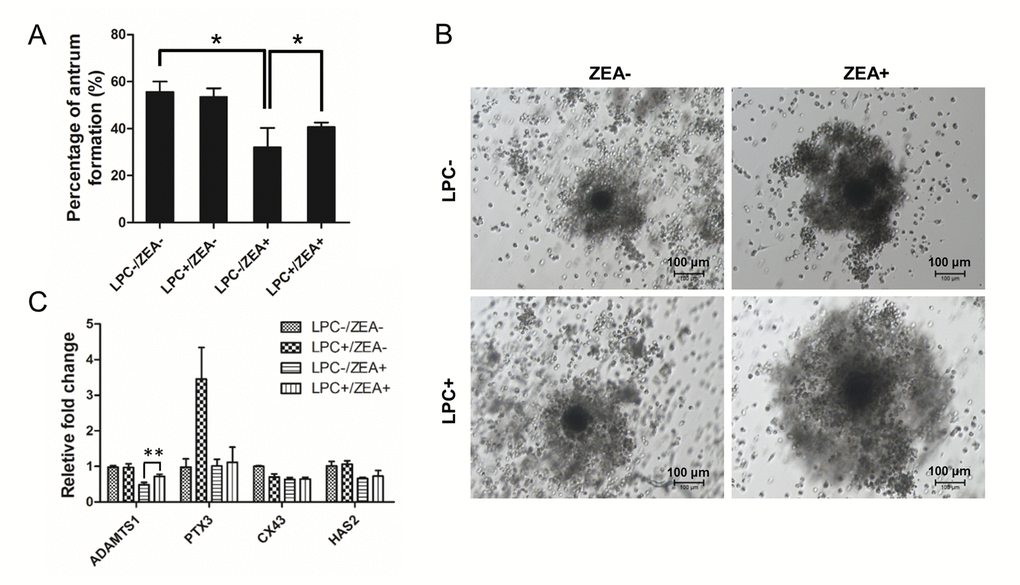 During oocyte maturation process, cumulus cells (CCs) undergo an obvious expansion process with extracellular matrix (ECM) composition. CC expansion need rapid HAS2 gene expression to synthesis hyaluronic acid-rich ECM, PTX3 gene expression to promote ECM stabilization, and gap junction protein encode CX43 gene expression [22]. For OGCs growth, 10 µg/mL LPC could protect the inhibition of 10 µM ZEA on antrum formation to some extent (P < 0.05; Figure 6A). The morphology of the cumulus-oocyte complexes (COCs) showed an impairment in CC expansion following ZEA treatment, while in the 10 µg/mL LPC and 10 µM ZEA co-treated groups, it seemed like LPC could at least partially protect CCs from the damage on expansion (Figure 6B). Gene expression results were also proved that CC expansion related gene ADAMTS1 expression was depressed by 10 µM ZEA treatment, the gene which was need for normal ovulation, and could be partially protected by 10 µg/mL LPC co-treated (P < 0.01; Figure 6C). ZEA also slightly repressed CX43 and HAS2 gene expression but not obvious, and almost no effect on PTX3 expression. We co-treated COCs with 10 µg/mL or 100 µg/mL PAF and 10 µM ZEA, the morphology results showed that PAF were unable to remit the poor CC expansion status (Figure S4A).