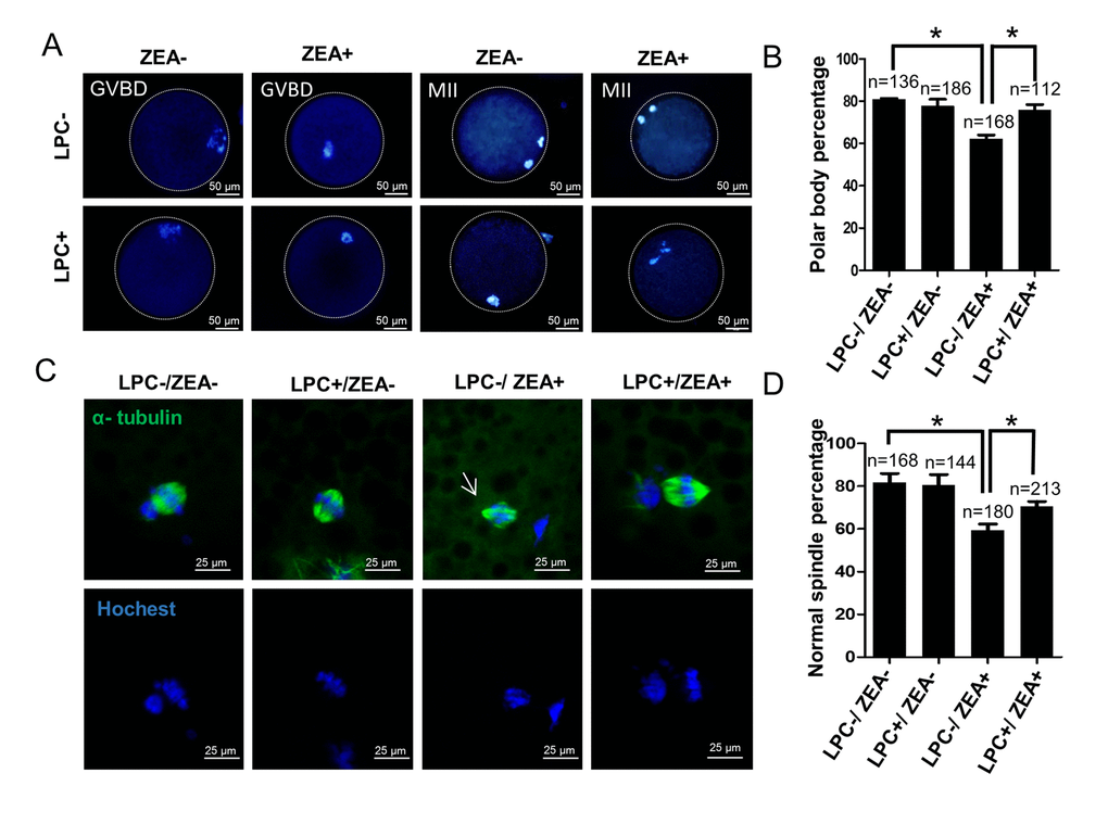 Next, we investigated the effect of 10 μM ZEA and 10 µg/mL LPC co-treatment on germinal vesicle breakdown (GVBD) and polar body extrusion (MII) (Figure 7A and 7B, FFigure S4B). Compared with the ZEA treated group (62.0 ± 5.02%), LPC could significantly protect the inhibition of ZEA on oocyte maturation (75.6 ± 6.86%; P < 0.05; Figure 7B). We further detected the effect of ZEA on the meiosis spindle assembly of oocytes. The result showed that compared with control group (81.7 ± 7.37%), ZEA treatment significantly decreased the percentage of normal spindle assembly in oocytes (59.3 ± 5.13%; P < 0.05), and LPC could protect the inhibition of ZEA on the spindles assembly (70.7 ± 3.79%, P < 0.05; Figure 7C and 7D).