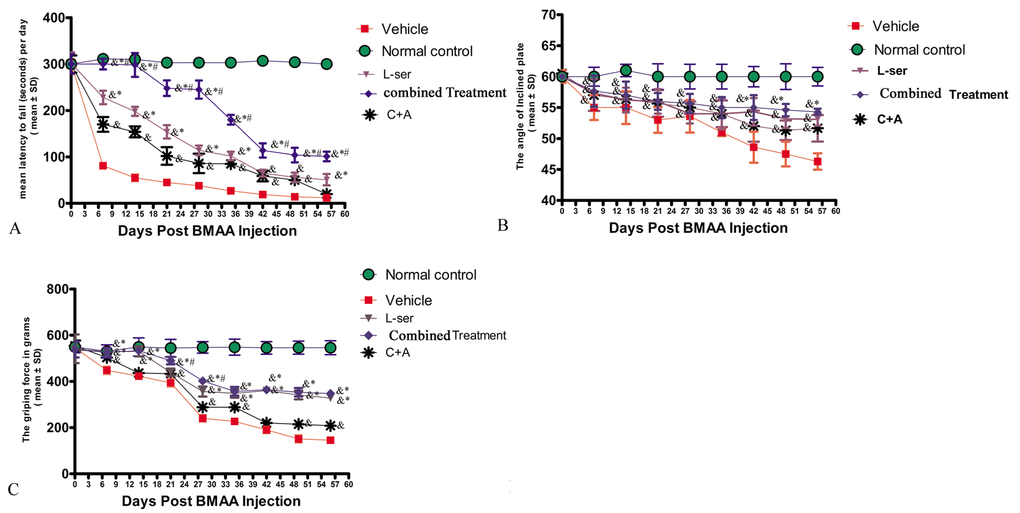 Importantly, the vehicle-treated model rats had considerably more severe functional impairments than model rats treated with C16+Ang-1 and L-serine, individually or in combination, with those receiving both treatments showing the greatest effect at each time point (Fig. 1A-C). The data indicated that L-BMAA treatment led to a marked reduction of muscle force both in forepaws and hind paws, which worsened with time, but could be reversed by C16+Ang1 and L-serine treatments, with the combined treatment yielding the best effects in improving motor function.