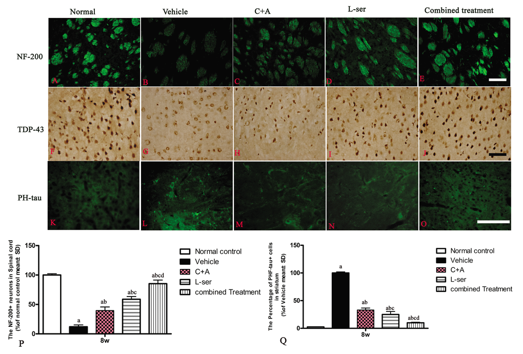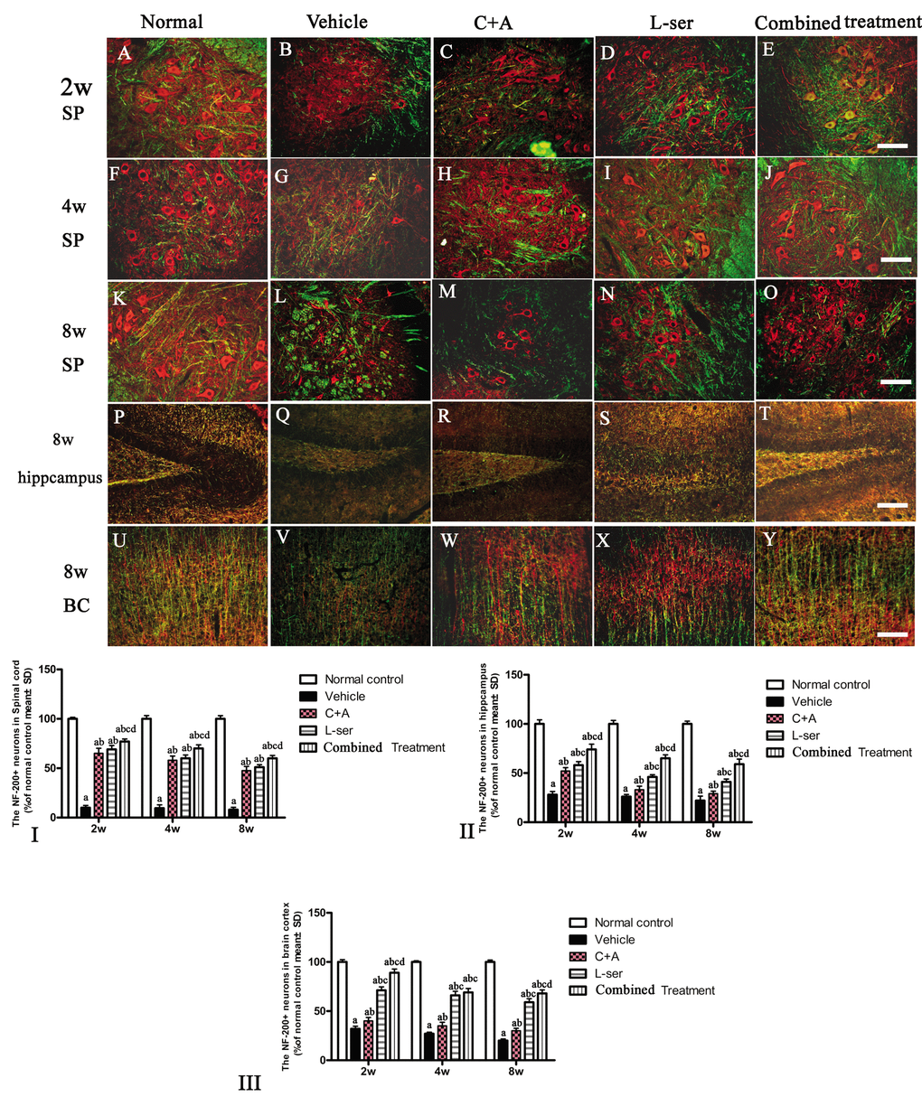 L-BMAA induced neurofilament disintegration and axonal destruction, which were reversed by C16+Ang-1 and L-serine and to an even greater extent by the combined treatment