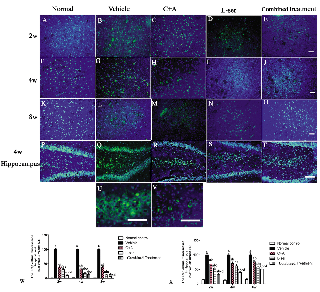 In most neurodegenerative conditions, extensive neuronal destruction and autophagy occur. Immunohistochemical staining was employed to detect the presence of the autophagy marker LC3B. L-BMAA injection decreased LC3B expression, and LC3B fluorescent labeling was observed in the cytoplasm of both spinal cord anterior horn neurons and hippocampal neurons (Fig.11).