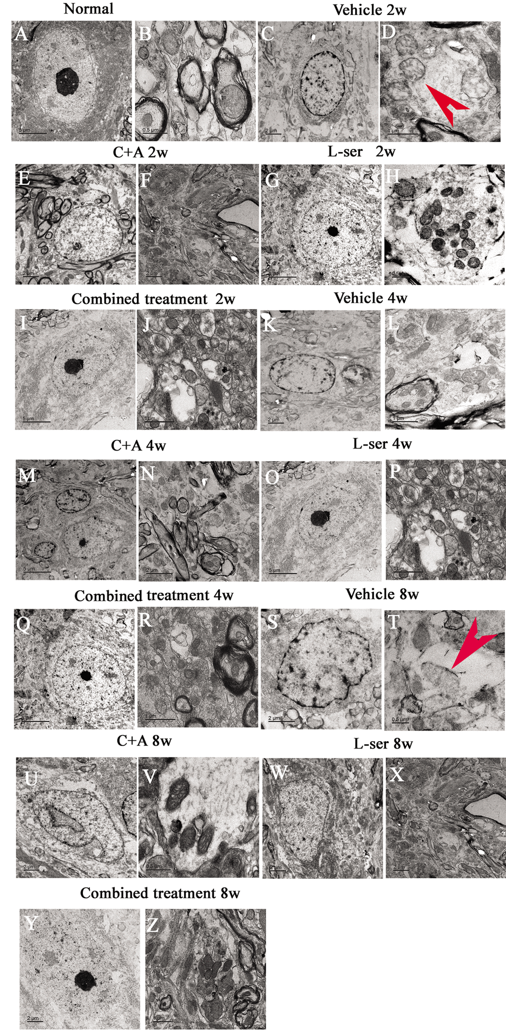 EM examination revealed alterations including mitochondrial vacuolization and distended mitochondrial cristae after L-BMAA injection (arrows in Fig. 12D), and the myelin sheath of nerve fibers exhibited cleaving, vacuolization, and loose and fused changes (Fig. 12L, T). At the late phase (8 weeks), some of the mitochondria had undergone complete deterioration with total loss of cristae (arrows in Fig. 12T). Neurons exhibited features of apoptosis with a contracted nucleus and compressed, disintegrated and marginated nuclear chromatin (Fig. 12C,K,S). L-BMAA activated the pro-apoptotic enzyme caspase-3 as evidenced by immunofluorescence staining (Fig. 8L). Nissl staining revealed progressive neuronal destruction in the spinal anterior horn and hippocampi of the model rats (Fig. 13). The C16+Ang-1 and L-serine treatments attenuated the elevated expression of LC3, reduced the number of caspase-3–positive neurons, and maintained essentially normal morphological features of the nuclei and mitochondria. Moreover, the combined treatment yielded improved results compared with the single treatments (Figs. 8,11,12,13).