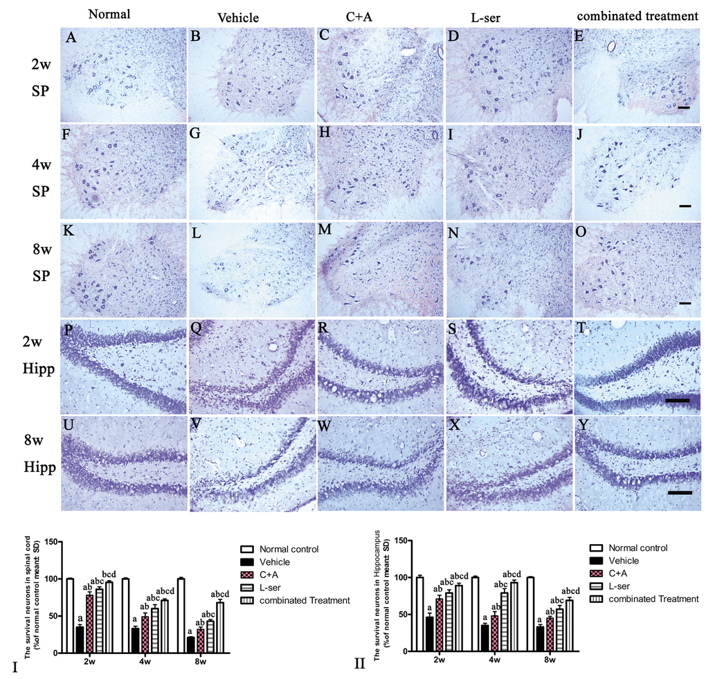 Cresyl violet (Nissl) staining was employed to evaluate inflammation and the number of viable neurons within the sections of CNS tissues. Five sections of the cortex, hippocampi, and spinal anterior horn from each animal were chosen randomly, and micrographs of three fields of vision in each section were taken at 200× magnification. In each image, the numbers of neurons with distinct nucleoli as well as cell bodies with abundant endoplasmic reticulum were counted.