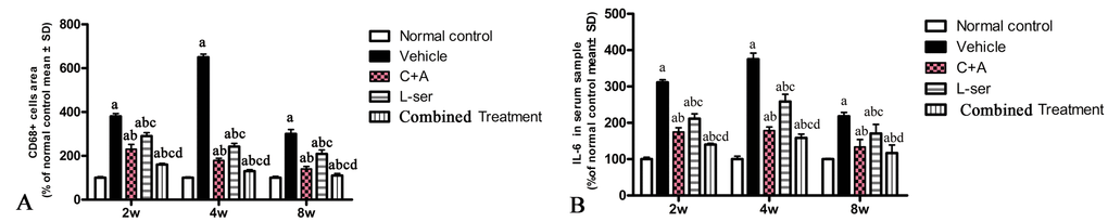 CD68, a marker of activated microglia and extravasated macrophages, was increased by L-BMAA initially, reaching a maximal level at 4 weeks but declining appreciably by 8 weeks after injection (Fig. 2G,L). C16+Ang-1 treatment and the combined treatment markedly alleviated the infiltration of inflammatory cells, and the combined treatment produced better results than those observed with L-serine treatment alone (Fig. 2P). Moreover, the serum level of IL-6, which can induce a transcriptional inflammatory response, followed a trend similar to CD68 expression after L-BMAA injection, and treatment with C16+Ang-1 and L-serine plus C16+Ang-1 remarkably decreased IL-6 expression compared with L-serine treatment alone (Fig. 2Q).