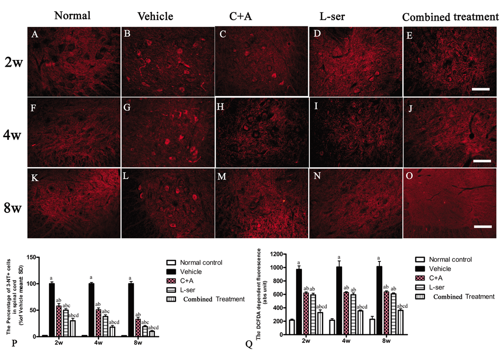 Immunostaining for 3-NT, a special marker of nitrogen species production, in sections of lumbar spinal cords showed clearly enhanced labeling in the vehicle-treated rats from 2–8 weeks after L-BMAA injection, which was markedly attenuated by C16+Ang1 treatment and L-serine treatment (Fig. 3). The combined treatment yielded the most significant effects as revealed by cell quantification (Fig. 3P). The production of ROS in the different groups is shown in Fig. 3Q. The amount of ROS produced in vehicle-treated model group was significantly higher than that in the other groups. Notably, while the ROS level was diminished in the C16+Ang-1 and L-serine treated groups, the group that received combined treatment exhibited the lowest ROS levels starting from the early stage (2 weeks after L-BMAA injection) to the late stage (8 weeks after L-BMAA injection; Fig. 3Q).