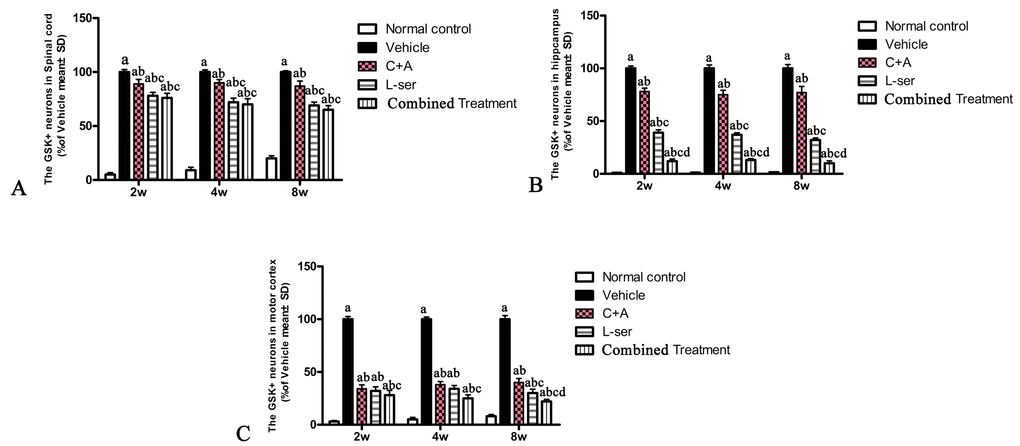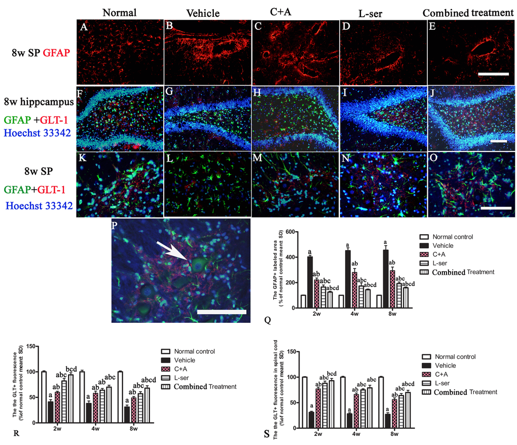 In the vehicle-treated model group, L-BMAA injection led to augmented expression of GSK3β in the spinal cord, hippocampus and motor cortex (Fig. 4). Staining for GFAP, a marker of astrocytes, showed the increased proliferative activity of these cells and formation of a visible glial scar. However, astrocytic glutamate transporter (GLT-1), another marker of astrocyte pathology, was obviously decreased in the vehicle-treated group, implying a reduction in the astrocytic glutamate transport capacity (Fig. 5). The up-regulation of GSK3β, reactive gliosis and down-regulation of GLT-1 were all significantly reversed by C16+Ang-1 treatment, and further still by L-serine treatment. The combined treatment group showed the best effects (Figs. 4-5).