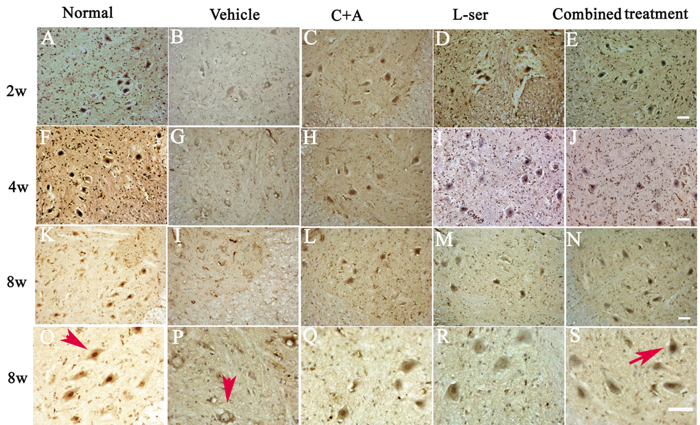TDP-43 expression is usually confined to the nucleus, as displayed in Figure 6 in the motor neurons in the normal control (Fig. 6, arrow in O). In the vehicle-treated group, reduced nuclear expression of TDP-43 was accompanied by the emergence of some cytosolic staining in some deteriorating motor neurons 2–4 weeks after L-BMAA injection (Fig. 6B, G). Decreased TDP-43 expression in the nuclei of injured motor neurons was noted 8 weeks after L-BMAA administration, and the nuclei displayed a bulge and vacuolated morphology (indicated by arrows in Fig. 6P). However, in the C16+Ang-1 or L-serine–treated rats, TDP-43 labeling in large motor neurons mainly accumulated in the nucleus unlike in the control group, and this effect was even more obvious in the combined treatment group (indicated by arrow in Fig. 6S).