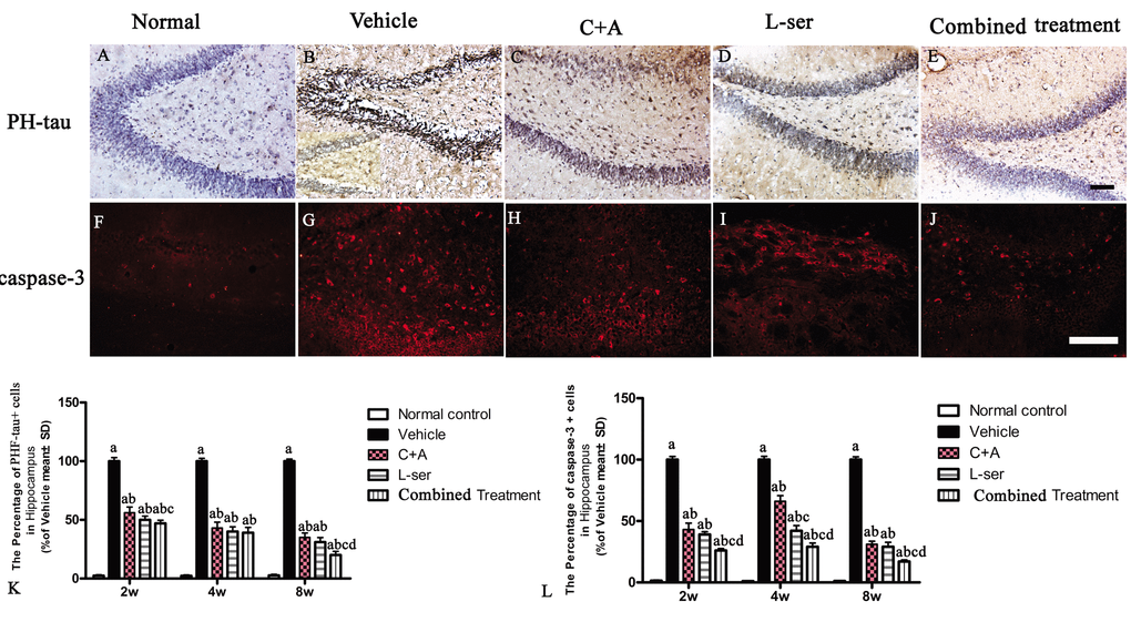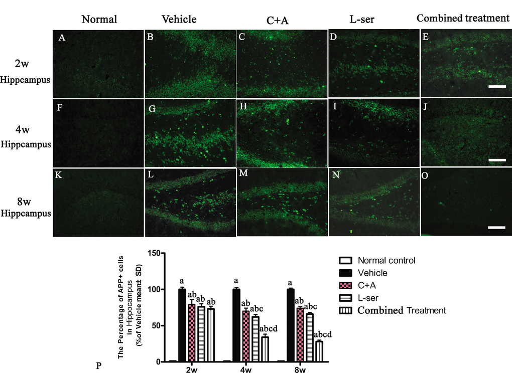 Increased labeling of APP, the main mediator of proamyloidogenic pathway activation, was detected in the hippocampus of the vehicle-treated model rats (Fig. 7), and immunostaining for hyper-phosphorylated tau (abnormal phosphorylation of tau) was increased in neurons of the hippocampus compared with that in the normal control rats (Fig. 8B). Both phenomena were obviously attenuated by C16+Ang-1 and L-serine treatment, and the group that received combined treatment showed the most significant effects as revealed by cell quantification (Figs. 7 and Fig. 8K).