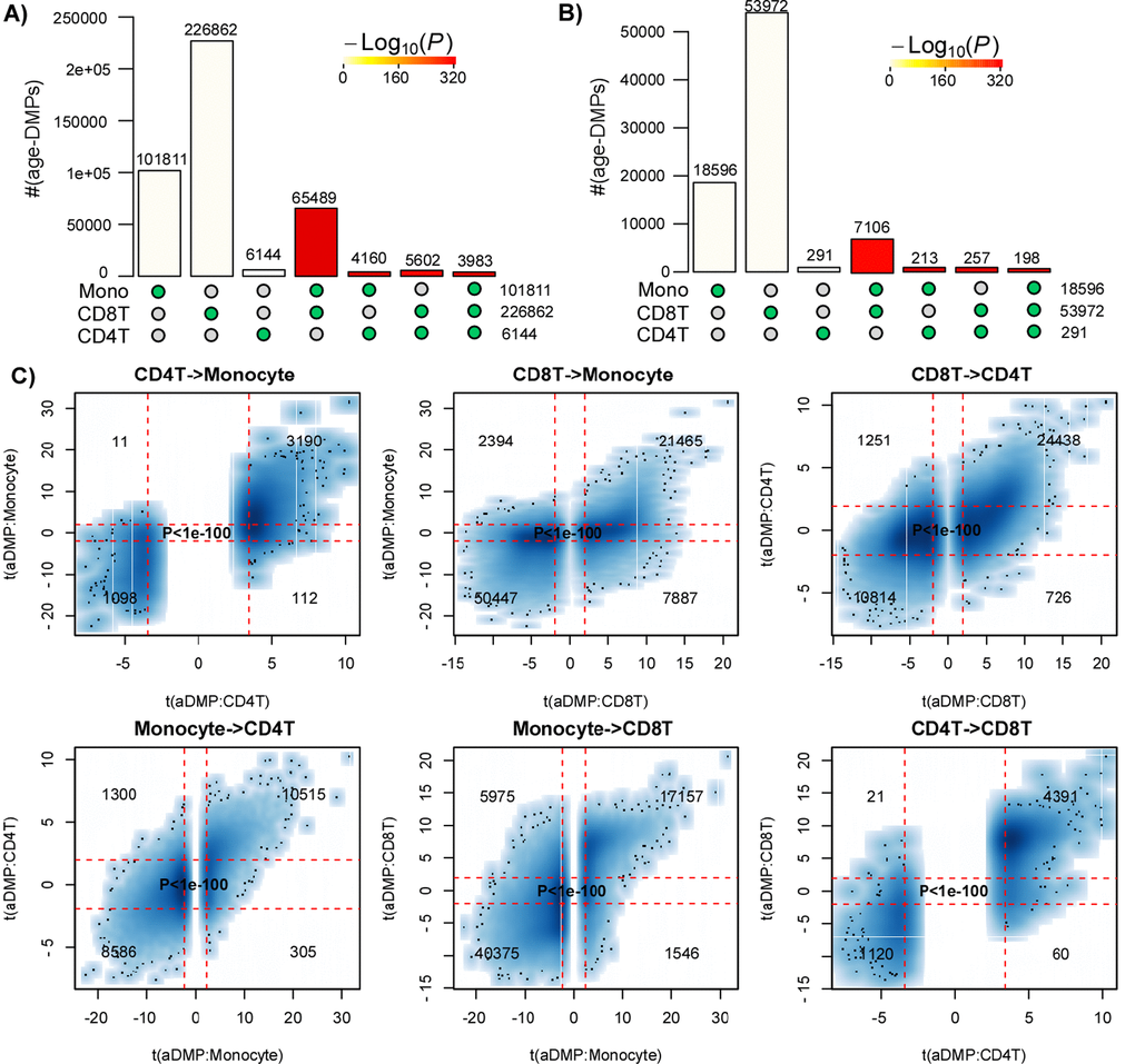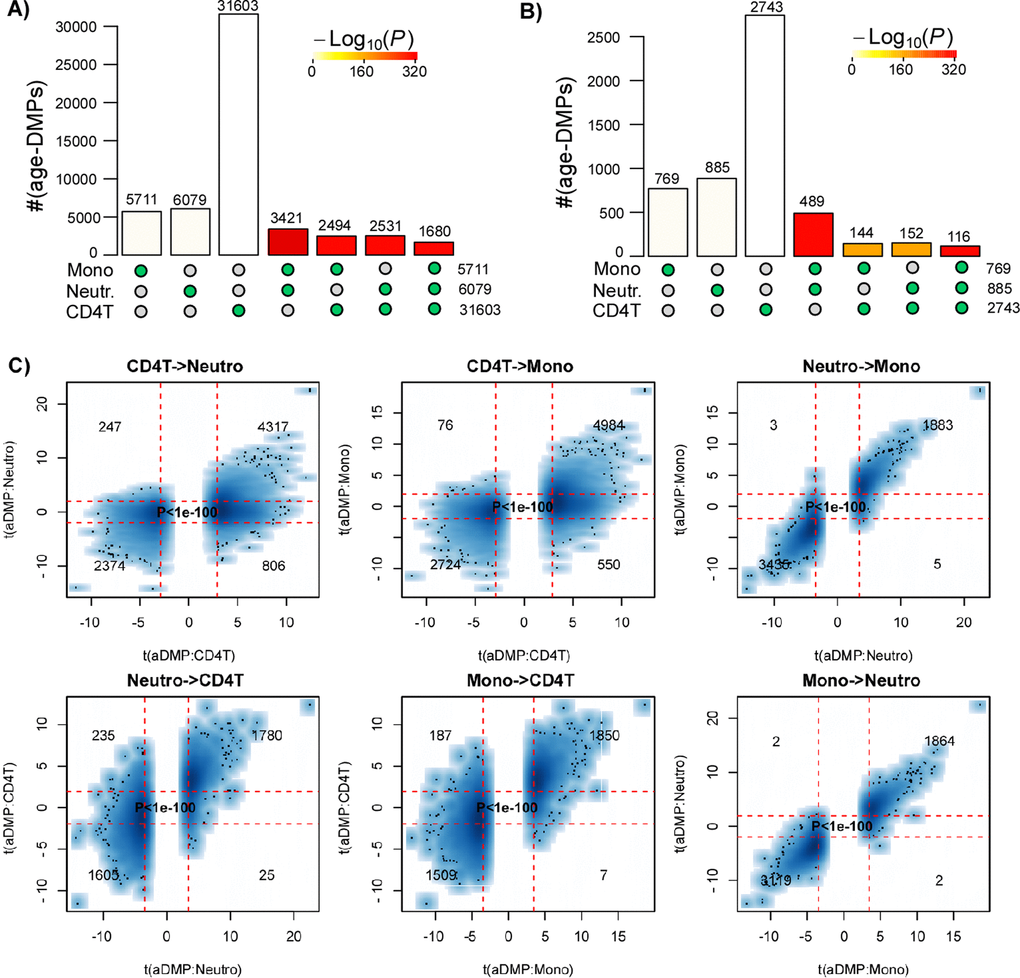 Thus, assuming that the fraction of aDMPs (~90%) in the Reynolds monocyte set is inflated due to some confounder, it is unlikely to be inflated by more than 25%, since the fraction of predicted aDMPs in two large whole blood studies was consistently over 65%. This supports the view that a very high fraction (likely to be well over 65%) of the DNA methylome of blood cell subtypes is altered with age, and therefore this also means that there would be a large overlap of aDMPs between any two blood cell subtypes, consistent with our observations. Moreover, the fact that we observe equally strong overlaps of aDMPs between tissues like blood and cervix, further suggests that relatively high fractions of the DNA methylome of other cell-types (e.g. epithelial and fibroblasts) are also altered with age.
