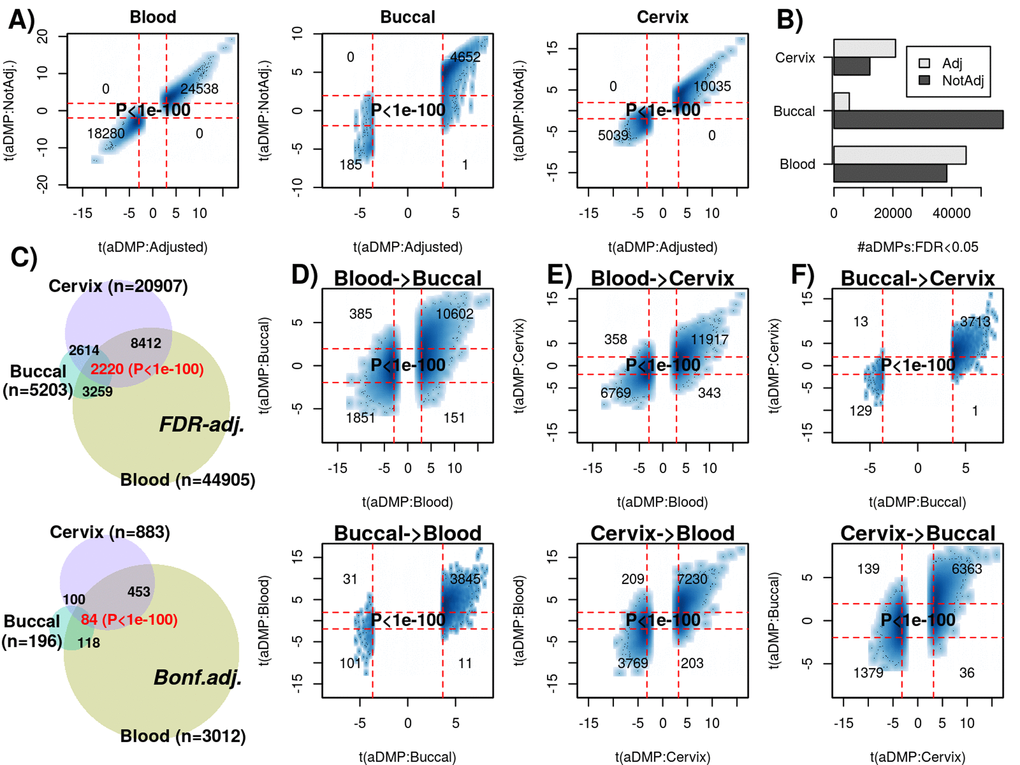 In a nutshell, their argument was based on a lack of “substantial overlap” of aDMPs derived from different tissues, either when using a very stringent Bonferroni-adjusted threshold, or when using a threshold on the effect size, which in principle is sample-size independent. In our view, this analysis is problematic. First of all, to state that overlaps of aDMPs were not substantial without assessing the statistical significance of the overlaps themselves is a common pitfall not unique to their study. The expected number of overlapping aDMPs will naturally be small if a very stringent Bonferroni correction is used to define aDMPs. Even so, and as demonstrated here using several multi- tissue and multi-cell type EWAS, the overlaps using Bonferroni thresholds were highly statistically significant, a strong cue that the number of overlapping aDMPs between tissues and cell-types is not random. Indeed, using a more relaxed FDR<0.05 threshold, we have seen that there are at least thousands of aDMPs that are shared between blood cell-subtypes and also between unrelated tissues such as blood, cervix and buccal.