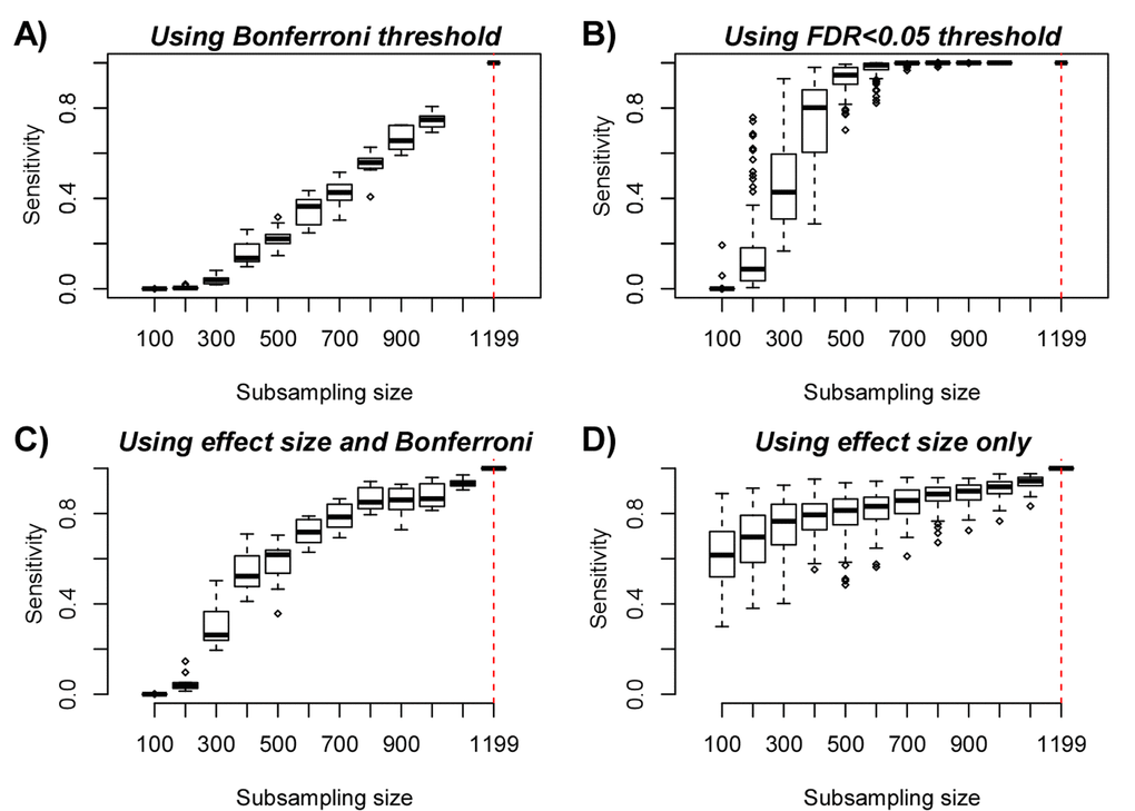 We used the large (n=1199) purified monocyte sample set from Reynolds et al. to define a gold-standard list of 18596 monocyte aDMPs using a Bonferroni threshold. We then subsampled 100, 200, 300, 400, 500, 600, 700, 800, 900, 1000 samples from the original 1199 and redefined aDMPs at each subsampling size using the same Bonferroni threshold. At each subsample size we estimated the sensitivity to detect the 18596 aDMPs from the full set. A total of 10 different runs were performed at each subsample size. We also derived aDMPs and sensitivities at each subsample size but now using an FDR<0.05 threshold. Because the FDR estimation is more unstable, we performed 100 different Monte-Carlo runs at each subsampling size.