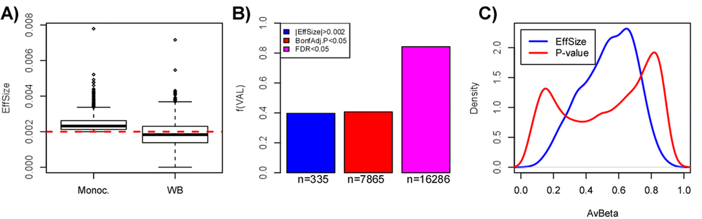 A second major problem associated with using an effect size threshold to select and validate aDMPs is related to confounding factors such as cell-type heterogeneity, which may artificially deflate effect sizes in spite of associations with age remaining highly significant. To demonstrate this, we posited that the fraction of aDMPs derived in the monocyte set that would validate in a large whole blood set [10] (which contains monocytes) would be much reduced if an effect size criterion is used throughout, as compared to using a statistic and P-value. Confirming this, out of the 844 aDMPs with an effect size larger than 2% over 10 years in the Reynolds monocyte set, only about 40% passed this same threshold across the 656 whole blood samples from Hannum et al. [10] (Fig. 5A-B). While the fraction validating in whole blood was similar if a Bonferroni threshold is used (fraction was 41%), the fraction doubled to 84% if an FDR<0.05 threshold was used instead (Fig. 5B). Thus, using only an effect size threshold to select and evaluate overlap of aDMPs between studies could lower sensitivities by as much as another 40% in relation to using an FDR-based threshold. Of note, using effect size thresholds in the original beta-value basis, which is highly heteroscedastic, may also strongly bias aDMPs towards those with intermediate DNAm values. Indeed, we verified that selecting aDMPs using the 2% change over 10-year threshold resulted in very few or no aDMPs with mean DNAm values close to 0 or 1 (Fig. 5C). Since the mean DNAm level of a CpG site in a complex tissue may be strongly influenced by cell-type heterogeneity, using an effect size threshold to select or validate aDMPs could therefore easily miss a large fraction of true aDMPs.