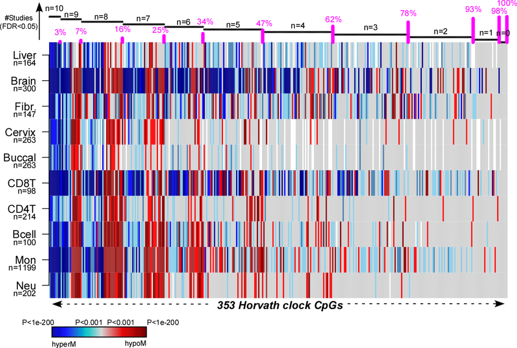 Finally, to demonstrate that there are indeed many examples of aDMPs that are shared between tissues, we analyzed in detail the 353 CpGs that make up Horvath’s clock [9]. Specifically, we computed their t-statistics and P-values using linear models against age, including potential covariates as confounding factors, across a total of 10 different cell/tissue types, which included Monocytes, CD4+ and CD8+ T-cells, B-cells, Neutrophils, Buccal, Cervix, Liver, Brain and Fibroblasts (Methods). In the case of buccal, cervix and liver we adjusted for variations in the epithelial, fibroblast and immune cell fractions, whereas in the case of brain we adjusted for variations in neuronal and non-neuronal fractions (Methods, Table S1). Although only 3% (i.e 10 CpGs) of the 353 clock CpGs were aDMPs in all 10 tissues, approximately 78% were aDMPs across at least 3 different cell/tissue types, with only 7% appearing to be “tissue or cell-type specific” (Fig. 6, Table S2). The 10 CpGs defining aDMPs in all 10 tissue/cell types mapped to genes that included VGF, GRIA2, FZD9, KLF14, RHBDD1, KCNC2, NHLRC1, P2RX6 and CECR6. Of note, FZD9 is a transmembrane receptor for Wnt signaling proteins, whilst GRIA2 is a glutamate neurotransmitter receptor, both of which have previously been demonstrated to be part of interactome “hotspots” of age-associated DNAm which occur independently of cell or tissue-type [23]. Thus, this confirms that ELOVL2 is not unique and that many of Horvath’s clock CpGs constitute aDMPs across several cell/tissue types.