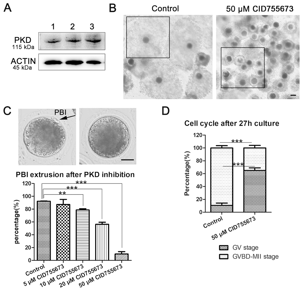 In this study, we first examined the existence of PKD and our results showed that PKD protein expressed in porcine oocytes (Figure 1A). And then we assessed COCs viability and oocytes maturation after PKD inhibition using the PKD specific inhibitor CID755673. After culturing for 44 h following different concentrations of 5 μM, 10 μM, 20 μM and 50 μM CID755673 treatment, we found that the expansion of the peripheral layers cumulus was seriously affected. As shown in Figure 1B, most of the cumulus cells was fully expanded in the control group, whereas partially expanded or not expanded cumulus were observed in 50 μM CID755673 treatment groups. Moreover, CID755673 treatment also disturbed PBI extrusion of porcine oocytes compared with the control groups. The percentage of PBI also confirmed this: as shown in Figure 1C, compared with the control group (92.41 ± 0.77%, n = 276), the PBI extrusion rates were markedly declined after CID755673 treatment in a dose-dependent manner. And the proportion of PBI was 87.37 ± 15.74% (n = 138, P > 0.05), 78.77 ± 3.68% (n = 245, P < 0.01), 56.42 ± 6.53% (n = 241, P < 0.001) and 10.11 ± 7.19% (n = 228, P < 0.001) in 5 μM, 10 μM, 20 μM and 50 μM CID755673 groups respectively. The failure of polar body extrusion led us to examine meiosis progression after PKD inhibition. After 27h culture, only 10.66 ± 7.18% (n = 179) of oocytes were arrested at GV stage, while most of 50 μM CID755673-treated oocytes were arrested at GV stage (65.09 ± 7.90%, n = 166, P < 0.001) (Figure 1D). These findings imply that PKD inhibition may cause the block of meiosis resumption and the failure of polar body extrusion during porcine oocyte maturation. To analyze the roles of PKD family on oocyte meiosis, a concentration of 20 μM was applied for subsequent studies.