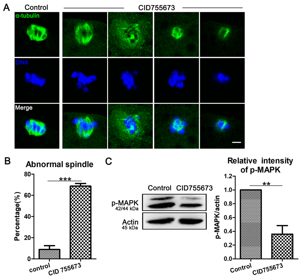 Since proper spindle formation is critical for the polar body extrusion during oocyte maturation, we assessed spindle morphology after PKD inhibition. As shown in Figure 2A, most oocytes exhibited a typical barrel-shaped spindle apparatus and well-aligned chromosomes on the metaphase plate in the control group; however, it displayed disorganized spindles with severely misaligned chromosomes in CID755673 treatment oocytes. The statistical data of abnormal spindle also confirmed this: As shown in Figure 2B, compared with 8.80 ± 7.39% (n = 154) abnormal spindle in control oocytes, up to 68.70 ± 4.98% (n=112, P < 0.001) CID755673-treated oocytes displayed disorganized spindles and misaligned chromosomes. We next explored the possible regulatory mechanism for the roles of PKD on spindle formation in oocytes. Our results showed that the expression of p-MAPK was remarkably reduced after CID755673 treatment. The relative intensity of p-MAPK also confirmed this (1 versus 0.36 ± 0.25, P < 0.01; Figure 2C). Taken together, our data imply that PKD is involved in the regulation of MAPK phosphorylation for meiotic spindle organization during porcine oocyte meiosis.