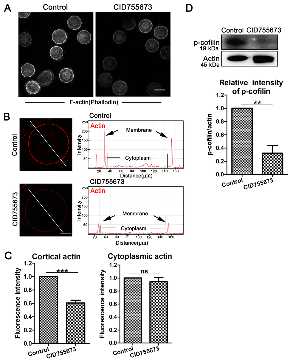 In addition, actin filaments are also the general power for the extrusion of polar body in oocytes. We also assessed the arrangements of the actin filaments in oocytes after CID755673 treatment. In our study, F-actin staining with phalloidin was applied, as shown in Figure 3A, the accumulation of actin signals at the cortical region significantly decreased in CID755673-treated oocytes compared with the controls, which was also confirmed by the actin fluorescence intensity analysis from the lineation (Figure 3B). Furthermore, quantitative analysis of cortical actin fluorescence intensity was also consistent with the above results, showing that inhibition of PKD substantially decreased actin intensity at the cortex of oocytes (1 versus 0.61 ± 0.08, n = 36; P < 0.001; Figure 3C). While there was no difference for the actin fluorescence intensity in the cytoplasm of CID755673 treatment oocytes compared with the control groups (Figure 3C). Actin assembly defects drove us to further explore the underlying regulator of PKD in porcine oocytes. As shown in Figure 3D, compared with the controls, the expression of p-cofilin was remarkably reduced after PKD inhibition. Quantitative analysis of p-cofilin band intensity also confirmed this (1 versus 0.32 ± 0.24; P < 0.01; Figure 3D). Therefore, these data suggest that PKD may be involved in cofilin phosphorylation for actin arrangement during porcine oocyte meiosis.