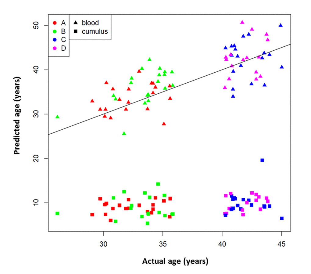 These data demonstrate that an age prediction model according to the methylation level of 353 CpG sites in DNA derived from WBCs accurately predicts the chronologic age of reproductive age women pursuing assisted reproduction. However, the methylation profile of CCs does not provide an accurate age prediction according to the same model. Indeed, the algorithm’s age prediction was consistently younger in CCs regardless of the age of the subject, a finding that was in agreement with TL measurements, where CCs presented in average longer telomeres than WBCs. Furthermore, categorization of patients according to ovarian response did not appreciably change the age prediction in WBCs or CCs, neither was it associated with relative telomere DNA length.