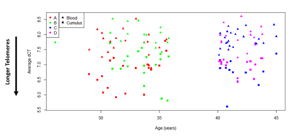 Telomere length (TL) is a known biomarker for biological aging and has been associated with the female reproductive lifespan [13,14]. Moreover, TL in WBCs has also been correlated with extrinsic epigenetic age acceleration (EEAA), a measure of DNA methylation derived from Horvath’s algorithm [15]. Therefore, it could be hypothesized that the relative amount of telomere DNA in follicular and white blood cells might as well differ in reproductive age women according to their age and ovarian response to stimulation. Indeed, a recent study reported that granulosa cells in patients with biochemical primary ovarian insufficiency (POI) possess significantly shorter telomeres than healthy controls, as was also the case for TL in leukocytes [16].