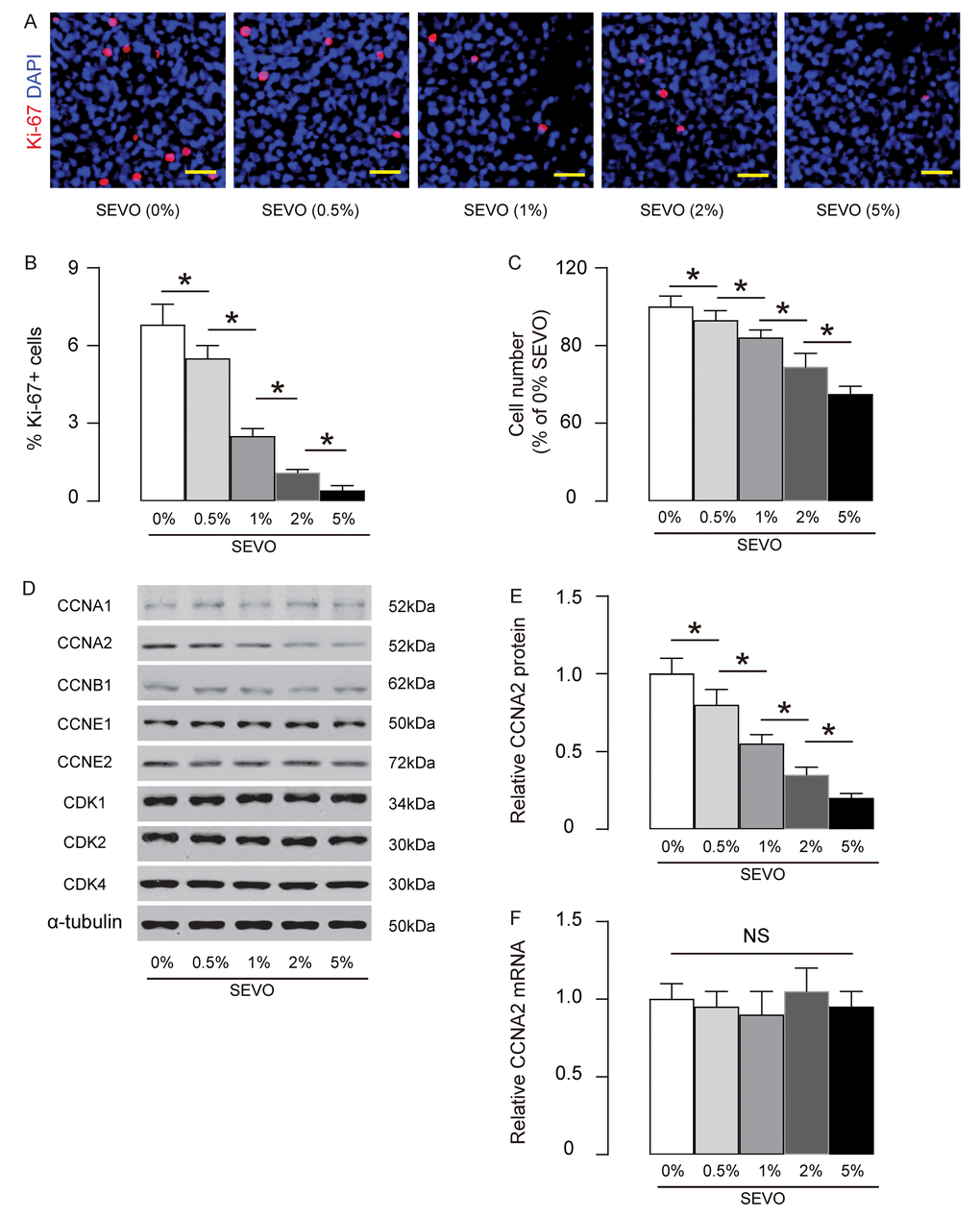 Next, we aimed to figure out the mechanisms underlying decreased neuron proliferation by SEVO. Identical number of HCV-2 neural cells was exposed to different doses of SEVO for 48 hours and then subjected to analysis. We found that SEVO dose-dependently decreased the Ki-67+ cells, shown by representative images (Figure 2A), and by quantification (Figure 2B). The total cell number was counted based on DAPI staining, showing that SEVO dose-dependently reduced the total cell number (Figure 2C). Thus, SEVO impairs neuron cell proliferation in vitro. Cell cycle was controlled by different CDKs and cyclins. We examined the levels of all CDKs and cyclins that were expressed in neural cells. We found that only CCNA2 was suppressed by SEVO dose-dependently (Figure 2D-E), but CCNA2 mRNA was not altered in SEVO-exposed HCN-2 cells (Figure 2F). These data suggest that SEVO impairs neuron cell proliferation in vitro likely through post-transcriptional suppression of CCNA2.