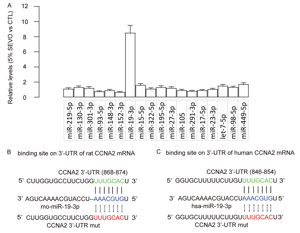 Based on abovementioned data, we hypothesized that SEVO may suppress CCNA2 by activating a CCNA2-targeting miRNA. Bioinformatics analysis showed that rat CCNA2 had 18 targeting miRNAs. The levels of these miRNAs in HCN-2 cells exposed to control gas or 5% SEVO were compared, and we screened for the upregulated targeting miRNAs which should be responsible for the suppression of CCNA2 by SEVO. We found that miR-19-3p was such a distinguished one that was significantly upregulated by SEVO (Figure 3A). Moreover, predictive binding of miR-19-3p onto 3’-UTR of CCNA2 mRNA was conserved on both rat (Figure 3B) and human (Figure 3C).