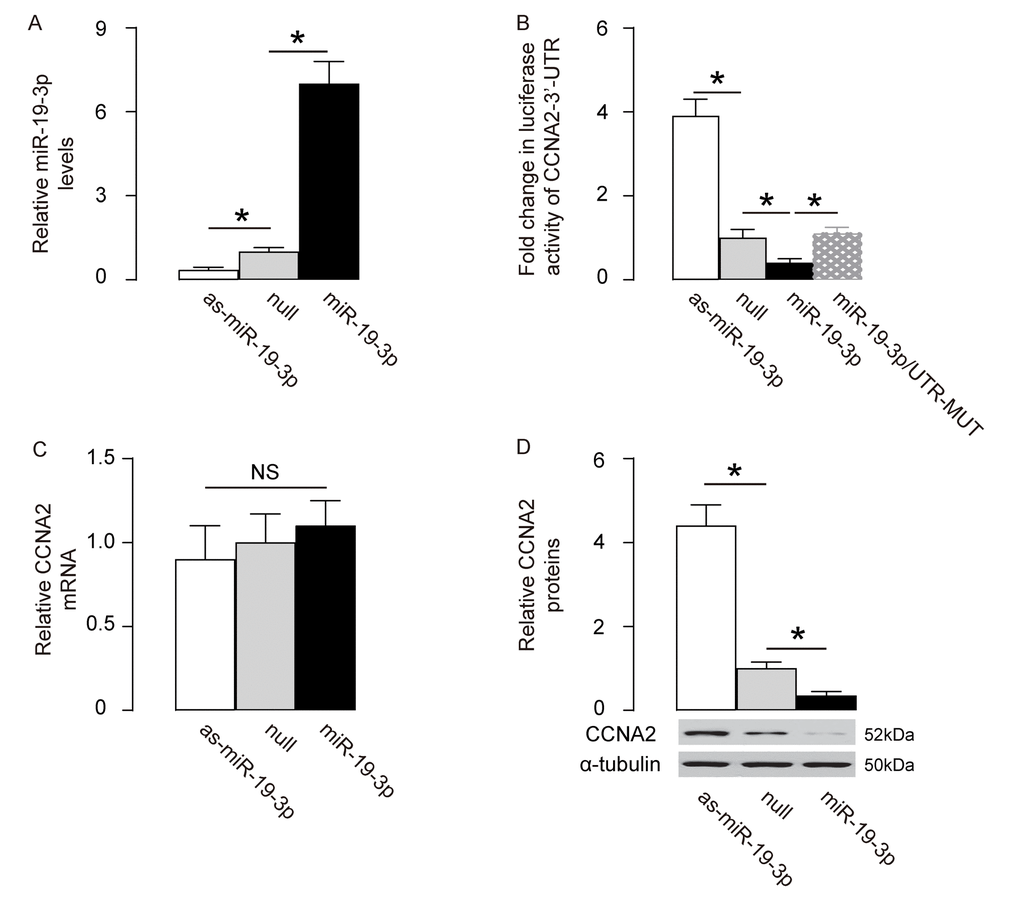 We assessed if the binding of miR-19-3p to CCNA2 is functional. First, miR-19-3p was overexpressed by a plasmid carrying miR-19-3p or knocked down by a plasmid carrying as-miR-19-3p in HCN-2 cells. Transfection with a null sequence was used as a control. The RT-qPCR for miR-19-3p levels was done to confirm the changes in miR-19-3p levels in these cells (Figure 4A). Next, an intact 3'-UTR of CCNA2 mRNA (CCNA2 3'-UTR) and an 3'-UTR of CCNA2 mRNA with a mutant at miR-19-3p-binding site (CCNA2 3'-UTR mut) were prepared. A dual luciferase reporter assay was performed using combinations of one miR-19-3p-modifying plasmid and one CCNA2 3’-UTR plasmid, showing that the specific binding of miR-19-3p to 3’-UTR of CCNA2 mRNA is functional in HCN-2 cells (Figure 4B). In addition, the mRNA levels of CCNA2 was not altered by modification of miR-19-3p levels in HCN-2 cells (Figure 4C), but the protein levels of CCNA2 significantly decreased by overexpressing miR-19-3p, and significantly increased by knocking down miR-19-3p (Figure 4D). Together, our data suggest that MiR-19-3p targets CCNA2 to suppress its translation in neural cells.