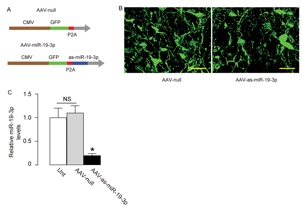 Plasmids carrying miR-19-3p or null or antisense for miR-19-3p (as-miR-19-3p) were constructed using corresponding sequence. Sequence for miR-19-3p: 5’- UGUGCAAAUCCAUGCAAAACUGA-3’; Sequence for as-miR-19-3p: 5’- UCAGUUUUGCAUGGAUUUGCACA-3’. For generation of adeno-associated virus (AAV), a pAAV-CMV-GFP plasmid (Clontech, Mountain View, CA, USA) was used. The backbone also carries a GFP reporter to allow visualization of the transduced cells by green fluorescence. Human embryonic kidney 293 cell line (HEK293, ATCC) was used for virus production. The pAAV-CMV-GFP plasmid, a packaging plasmid carrying the serotype 9 rep and cap genes, and a helper plasmid (Applied Viromics, LLC. Fremont, CA, USA) were triply transfected HEK293 cells by Lipofectamine 3000 reagent (Invitrogen). A CsCl density centrifugation method was used to purify virus, the titration of which was determined by a quantitative densitometric dot-blot assay. AAVs (5X1011 viral particles in 100µl) were intracranially injected into the bilateral hippocampi of the rats.