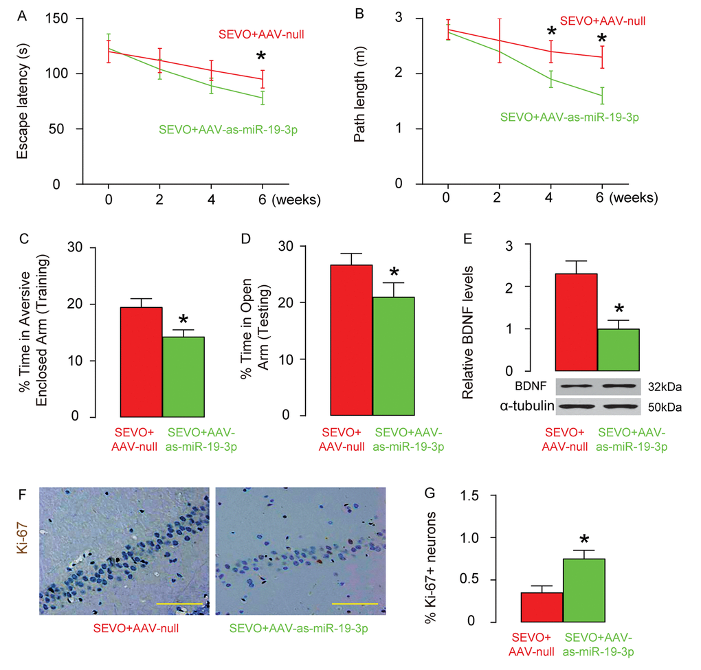 Finally, we evaluated the effects of abolishment of miR-19-3p upregulation on neuron proliferation, and learning and memory of rats that were exposed to SEVO. AAV-as-miR-19-3p or AAV-null was intracranially injected into the bilateral hippocampi of the neonatal rats (n=10 in each group). One week after injection, SEVO exposure was performed on these rats. Morris water maze test showed that post SEVO exposure, neonatal rats that had received AAV-as-miR-19-3p exhibited significantly better performance in both escape latency (Figure 6A) and path length (Figure 6B), compared to rats that had received AAV-null. Moreover, the rats were also assessed in PM-DAT at 6 weeks after SEVO exposure. We found that post SEVO exposure, neonatal rats that had received AAV-as-miR-19-3p exhibited significantly better performance in time spent in aversive arm at training period (Figure 6C), and in time spent in open arm at testing period (Figure 6D), compared to rats that had received AAV-null. These results suggest that both learning and memory of the neonatal rats are improved by miR-19-3p depletion after SEVO exposure. BDNF levels were examined in the rat brain 6 weeks after SEVO exposure, showing increases in BNDN levels in rats that had received AAV-as-miR-19-3p than rats that had received AAV-null (Figure 6E). Ki-67 staining was performed, showing increases in proliferating neuron cells the hippocampal area of rats that had received AAV-as-miR-19-3p than those that had received AAV-null, 6 weeks after SEVO exposure, by representative images (Figure 6F), and by quantification (Figure 6G). Together, these data suggest that abolishment of miR-19-3p upregulation protects neuron proliferation, and learning and memory of rats that were exposed to SEVO.