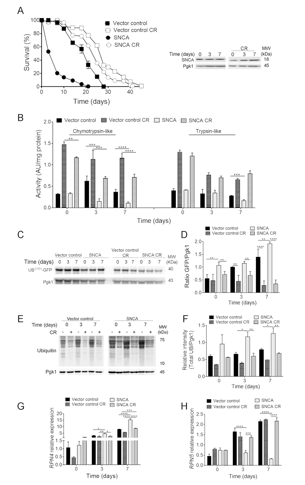 Overall, our data suggest that in proteotoxic stress conditions, the CR-mediated beneficial effects are associated with increased UPS activity accompanied by the maintenance of autophagy at homeostatic levels. Furthermore, although under CR conditions inhibition of each proteolytic activity leads to reduced longevity, the maintenance of autophagy at homeostatic levels appears to be the central pathway underlying rescue from SNCA-mediated toxicity.