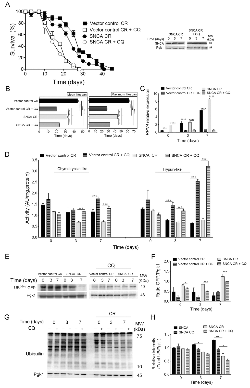 The crosstalk between UPS and autophagy is known to be critical for the surveillance and prevention of protein misfolding toxicity [26,32,33]. Our data showed that CR is able to modulate both UPS (Fig.1) and autophagy [21,34] in aged SNCA-expressing cells, suggesting a coordination between both in this scenario. To explore this hypothesis, autophagy was inhibited in CR conditions and the response of SNCA-expressing cells evaluated during aging. Inhibition of autophagy with chloroquine (CQ) in caloric restricted cells expressing SNCA resulted in a shorter CLS, as compared with cells expressing vector control in the same conditions (Fig. 2A and 2B). These results were further supported by the comparison of the mean (50% of survival) and maximum (10% of survival) lifespans of SNCA-expressing cells with vector control expressing cells, under CR in the presence or absence of CQ (Fig. 2B). These data suggest a relevant role of autophagy in CR-mediated lifespan extension of SNCA-expressing cells. Although autophagy inhibition resulted in a decreased CLS of caloric restricted SNCA-expressing cells (Fig 2A), the CLS of these cells is still increased when compared to SNCA-expressing cells under normal growth conditions (2% glucose) (mean lifespan of 23.1 ± 0.2 days versus 7.7 ± 0.6 days) (Fig. 1A). Next, we wondered about the contribution of UPS activity for the CR effects on the CLS of SNCA-expressing cells when autophagy is inhibited. Pharmacological inhibition of autophagy resulted in increased UPS activity along chronological aging as reflected by chymotrypsin- and trypsin-like activities (Fig. 2D) and by the decreased levels of UBG76V-GFP (Fig. 2E and 2F) in caloric restricted SNCA-expressing cells. The increase of UPS activity elicited by autophagy inhibition is further confirmed by a decrease of the protein ubiquitination profile (Fig. 2G and 2H) and of RPN4 mRNA levels in SNCA-expressing cells under CR conditions (Fig. 2C). Altogether, the data revealed that UPS and autophagy crosstalk under CR with increased UPS activity as a response to autophagy inhibition.
