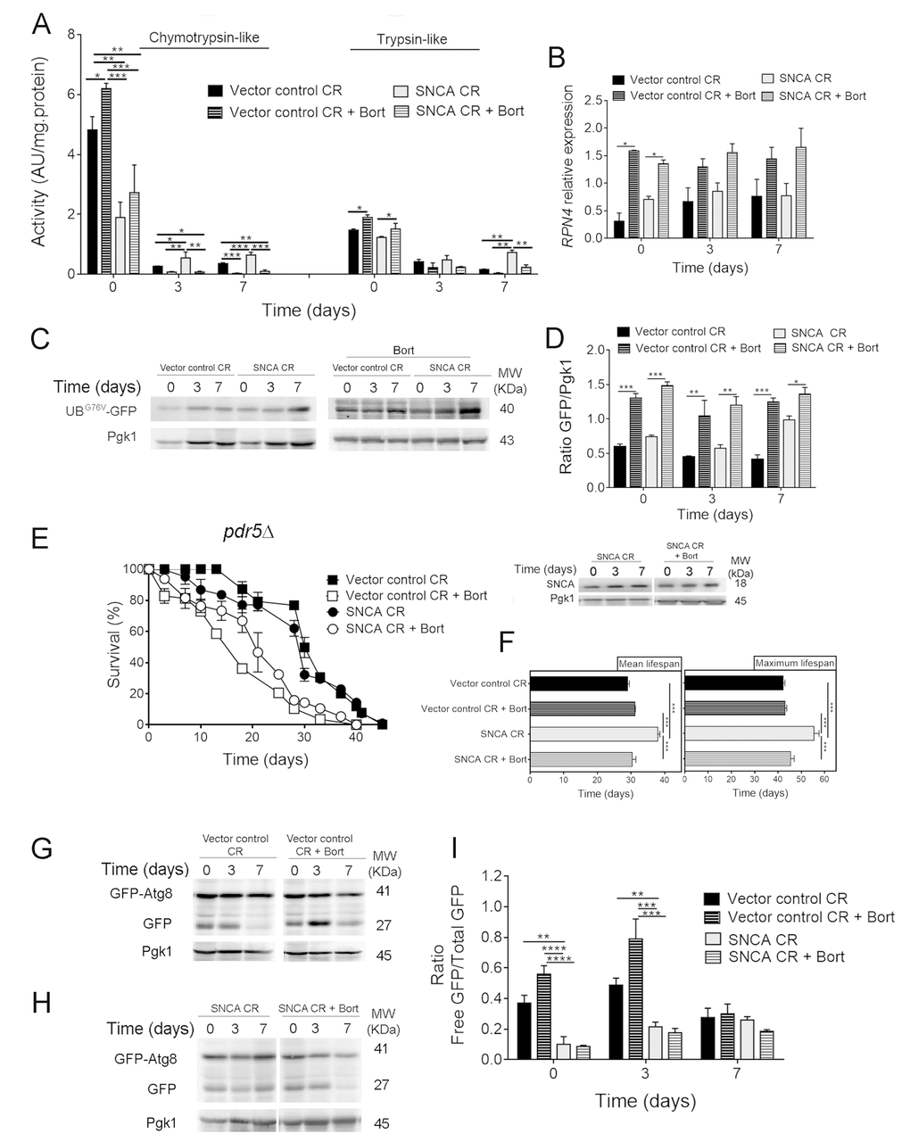 To further explore the crosstalk between autophagy and UPS in SNCA-expressing cells under CR conditions, UPS activity was pharmacological inhibited with two different proteasome inhibitors, bortezomib and MG132. The use of proteasome inhibitors in S. cerevisiae cells requires reduced drug efflux that is achieved by deletion of PDR5, a multidrug transporter involved in pleiotropic drug resistance [35]. Thus, pdr5Δ cells heterologous expressing SNCA were cultured under CR conditions and treated with proteasome inhibitors. The pharmacological inhibition of UPS activity was confirmed by the drastic reduction of chymotrypsin- and trypsin-like activities (Fig. 3A) and by the accumulation of UBG76V-GFP, promoted by bortezomib (Fig. 3C and 3D) and MG132 (data not shown), in SNCA-expressing cells under CR. The inhibition of UPS activity is also supported by the increased RPN4 mRNA levels (Fig. 3B).