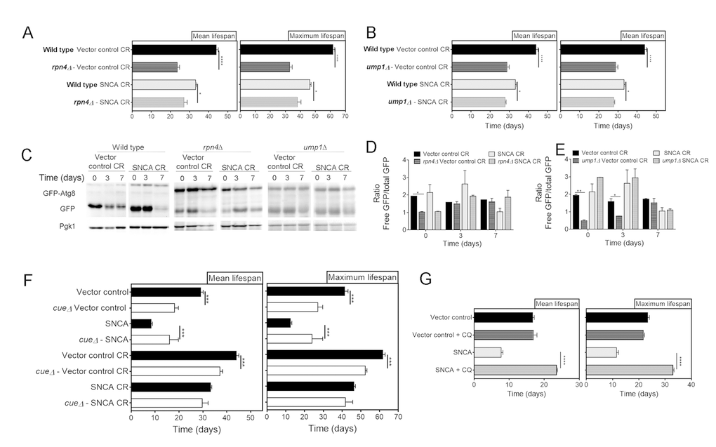 UPS activity was also genetically inhibited by deletion of UMP1 or RPN4. UMP1 deletion causes incorrect assembly of the 20S proteasome and reduced ubiquitin-mediated proteolysis [36], while RPN4 is a transcriptional regulator of the 26S proteasome [37]. Both mutants were confirmed to have impaired UPS activity (data not shown). The comparison of the mean and maximum lifespans of RPN4 and UMP1 cells expressing vector control or SNCA with the correspondent wild type cells revealed that genetic abrogation of UPS activity reduces CR-mediated extension of CLS (Fig. 4A and 4B). These results are in agreement with the observations made with pharmacological inhibition of UPS (Figure 3), pointing, once again, UPS as a relevant factor of CR-mediated longevity. Regarding autophagy, the results showed that genetic inhibition of UPS activity, by abrogation of RPN4 or UMP1, does not have a major impact on autophagy flux of caloric restricted cells expressing SNCA (Fig. 4C, 4D and 4E), as the pharmacological inhibition of UPS activity (Fig. 3).