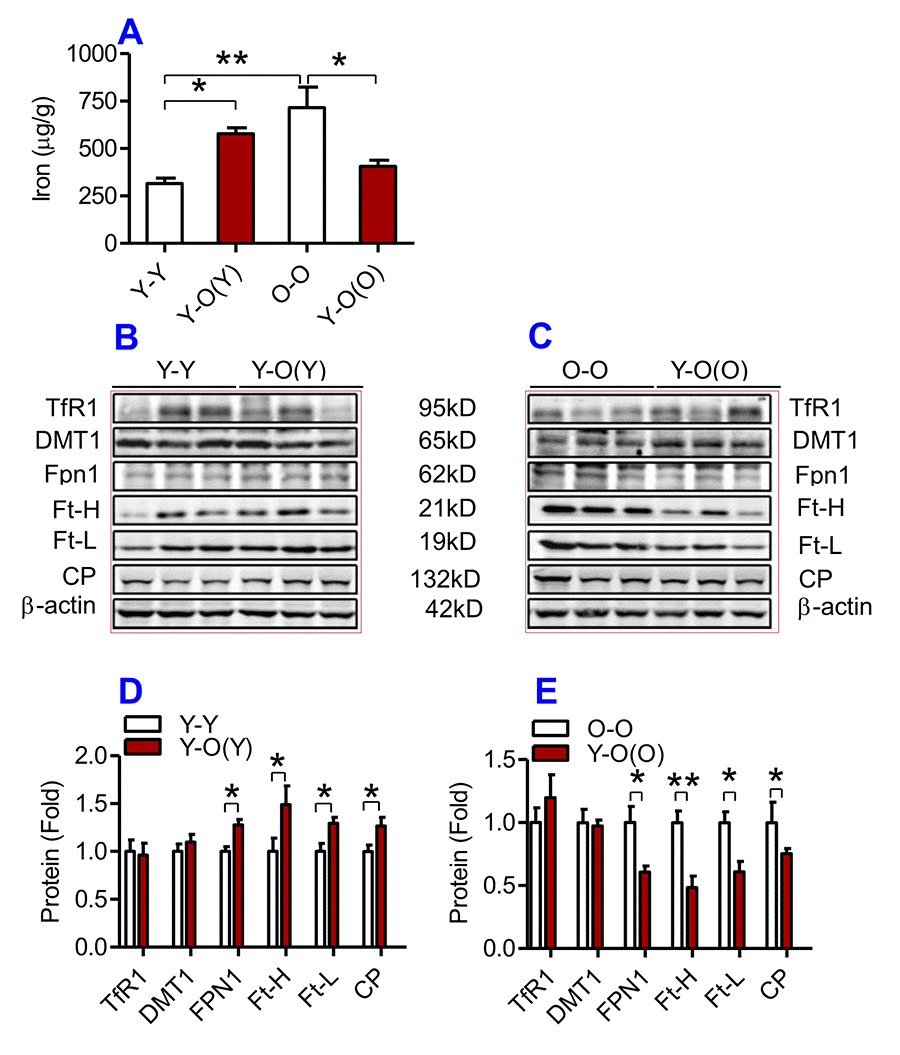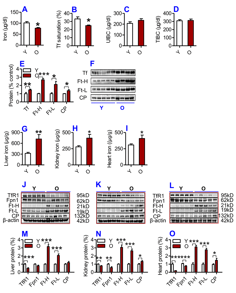 The opposite was true for serum iron however; the contents of iron and the expression of both Ft-H and Ft-L in the liver (Fig. 1G; J & M), kidney (Fig. 1H; K & N) and heart (Fig. 1I, L &O) were found to be significantly higher in old mice compared to young mice. The levels of CP were significantly higher, while the expression of TfR1 (Cell-iron import protein) and Fpn1 (Cell-iron export protein) in the liver (Fig. 1J & M), kidney (Fig. 1K & N) and heart (Fig. 1L & O) were lower in old mice compared to young mice.