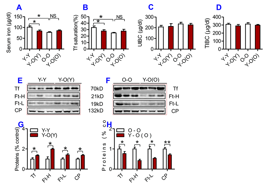 To investigate the effects of heterochronic parabiosis on serum and tissue iron level, we connected a young mouse and an old mouse (Y-O) to build a heterochronic parabiotic model, and two young mice (Y-Y) or two old mice (O-O) to build an isochronic parabiotic model, for 4-weeks. Blood chimerism and the physiological effects of a heterochronic parabiotic model were then examined (Supplementary Figure 1). After 4 weeks, mice were euthanized and all designed measurements were conducted. After 4 weeks of exposure to the circulation of an old mouse, serum iron level (Fig. 2A) and Tf saturation (Fig. 2B) were significantly reduced, accompanied by increased serum Ft-H, Ft-L, Tf and CP contents (Fig. 2E & G) in young mice as compared to the isochronic parabiotic mice (Y-Y). Conversely, old mice parabiosed to young mice had increased serum iron level (Fig. 2A) and Tf saturation (Fig. 2B) although the differences were not significant, and reduced serum Ft-H, Ft-L, Tf and CP contents (Fig. 3F & H) as compared to the isochronic parabiotic mice (O-O). There were no significant differences in UIBC (Fig. 2C) and TIBC (Fig. 2D) among the Y-Y, Y-O(Y), O-O and Y-O(O) groups.
