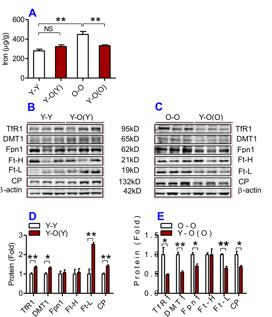 We then examined the effects of heterochronic parabiosis on the contents of iron, Ft-H and Ft-L and the expression of TfR1, DMT1, Fpn1 and CP in the liver, kidney and heart. Old mice (Y-O(O)) parabiosed to young mice had reduced iron levels in the liver (Fig. 3A) and kidney (Fig. 4A), and reduced expression of Ft-H, Ft-L, Fpn1 and CP in the liver (Fig. 3C & E), reduced expression of Ft-L, TfR1, DMT1, Fpn1 and CP in the kidney (Fig. 4C & E), and reduced expression of Ft-H, Ft-L and Fpn1 in the heart (Fig. 5C & E), as compared with the isochronic parabiotic mice (O-O). There were no significant differences in iron content in the heart (Fig. 5A), the expression of TfR1 and DMT1 in the liver (Fig. 3C & E), Ft-H in the kidney (Fig. 4C & E), and TfR1, DMT1 and CP in the heart (Fig. 5C & E) between Y-O(O) and O-O mice.