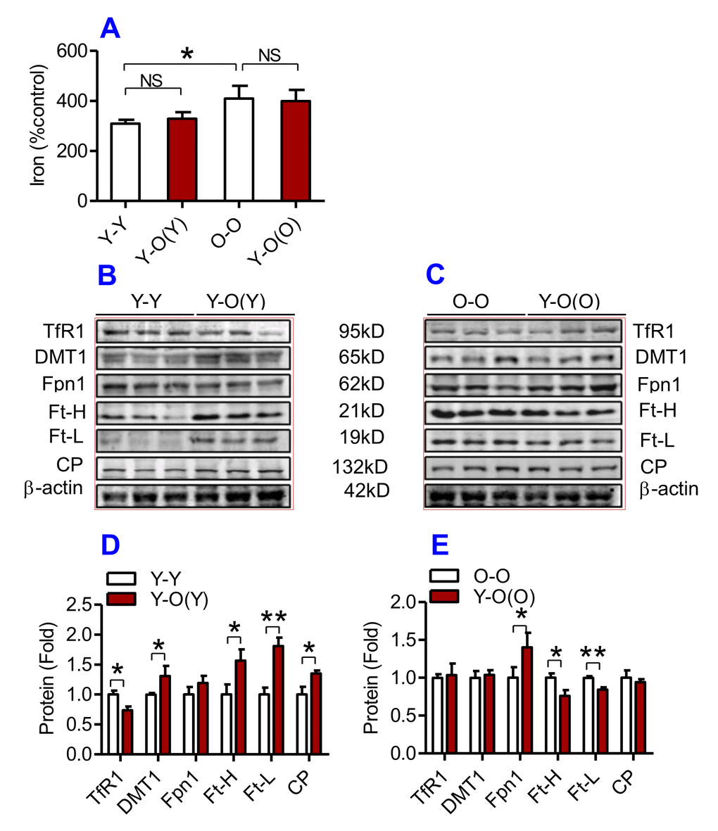 In contrast, young mice parabiosed to old mice (Y-O(Y)) had increased iron level in the liver (Fig. 3A), increased Ft-H, Ft-L, Fpn1 and CP contents in the liver (Fig. 3B & D), increased Ft-L, TfR1, DMT1 and CP contents in the kidney (Fig. 4B & D), and increased Ft-H, Ft-L, DMT1, CP and decreased TfR1 in the heart (Fig. 5B & D), as compared with the isochronic parabiotic mice (Y-Y). Iron levels in the kidney (Fig. 4A), and heart (Fig. 5A) were also lower in Y-O(Y) mice than in Y-Y mice, although the differences were not significant. There were no significant differences in the expression of TfR1 and DMT1 in the liver (Fig. 3B & D), Ft-H and Fpn1 in the kidney (Fig. 4B & D), and Fpn1 in the heart (Fig. 5B & D) between Y-O(Y) and Y-Y mice.