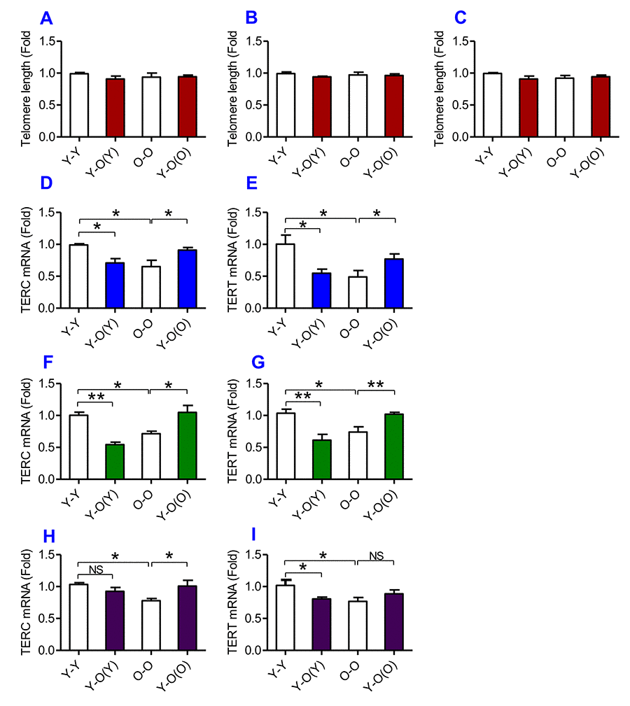 Heterochronic parabiosis down-regulated the expression of TERC and TERT mRNAs in young mice and up-regulated the expression of TERC and TERT mRNAs in old mice