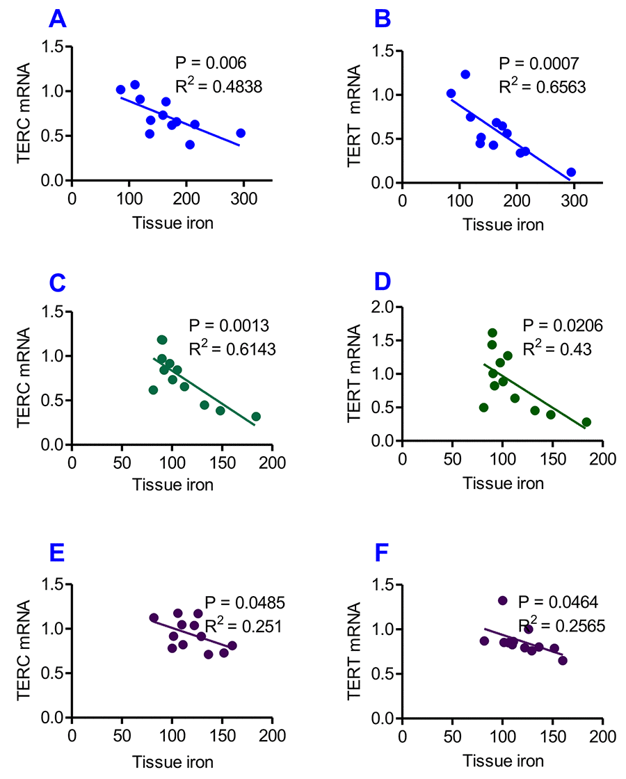 The evidence discussed above led us to speculate that the accumulation of iron in tissues with age may be one of the key harmful factors in the development of aging. We also hypothesized that the beneficial factors in young animals may be able to reduce iron contents in tissues and then exhibit an anti-ageing effect. Therefore, here we established parabiotic pairings between young and old mice (heterochronic parabiosis), exposing old or young mice to factors present in young or old serum respectively, and investigated the changes in serum iron, the contents of iron, the expressions of major iron transport proteins as well as TERT and TERC, and telomere length in the liver, kidney and heart of Y-O(O) (old mice paired with young), Y-O(Y) (young mice paired with old), O-O (pairings between two old) and Y-Y (pairings between two young) mice. We demonstrated that the reduced iron in the serum, the increased iron contents and the reduced expression of TERT and TERC in tissues of aged mice are reversible by exposure to a younger mouse’s circulation. These measurements in young mice were also reversible by exposure to an older mouse’s circulation. Correlation analysis showed that tissue iron contents are negatively correlated with TERT and TERC expression in the liver, kidney and heart of heterochronic parabiotic mice. These findings provide key insights into understanding the key role of iron in aging.