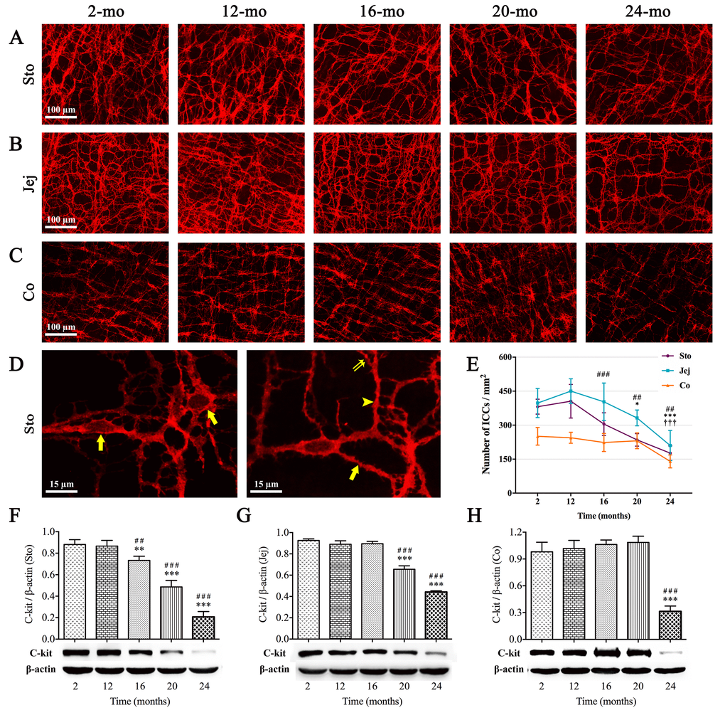 ICCs express the proto-oncogene c-kit related to the development and maintenance of ICCs [24]. The immunofluorescence staining (Fig. 2A-D) and western blot analysis (Fig. 2F-H) of c-kit showed that the proportions of ICCs in the MP region of the mouse GI tract including stomach, jejunum and colon all tended to decrease during aging. In the case of stomach, in 2-mo-old mice, the cell body of ICCs was big, their processes were thick and there were many secondary and tertiary branches, which interlaced and formed a complete network (Fig. 2D). As age increased from 16 mo, not only the number of ICCs in stomach was decreased, but also the processes presented fewer branches and cellular network was sparse. Like those in stomach, the similar tendency was also observed in either jejunum or colon, however, the alterations in ICCs appeared later considerably: it was at 20 mo in jejunum, and at 24 mo in colon (Fig. 2E). And age-related damage to cellular network was clearly observed in the colon of the oldest individuals (24-mo-old).