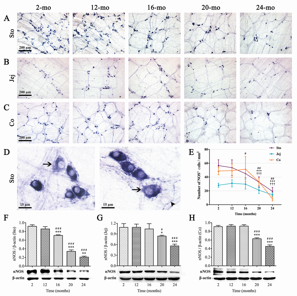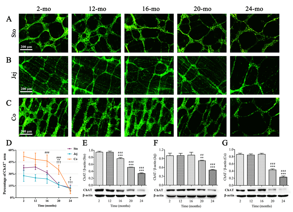 Therefore, the present study aims to elucidate the morphological alterations and quantitative assessment of enteric neurons including cholinergic and nitrergic neurons as well as its surrounding ICCs in the MP of mice aged 2, 12, 16, 20 and 24 months (mo). We also observed Cx43 protein expression in longitudinal muscle layer with the adherent MP and ICCs of young and old mice. All results were further validated in aged human colon. Our study demonstrated that the sparseness or absence of ICCs and enteric neurons, which first appeared in stomach and partially caused by inflammation, could contribute to the age-associated GI motility dysfunction. And the decrease of Cx43 expression occurred before ICCs and neurons loss in the GI tract.